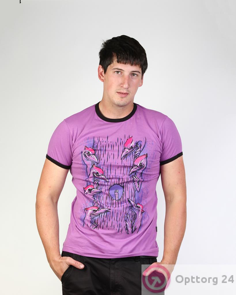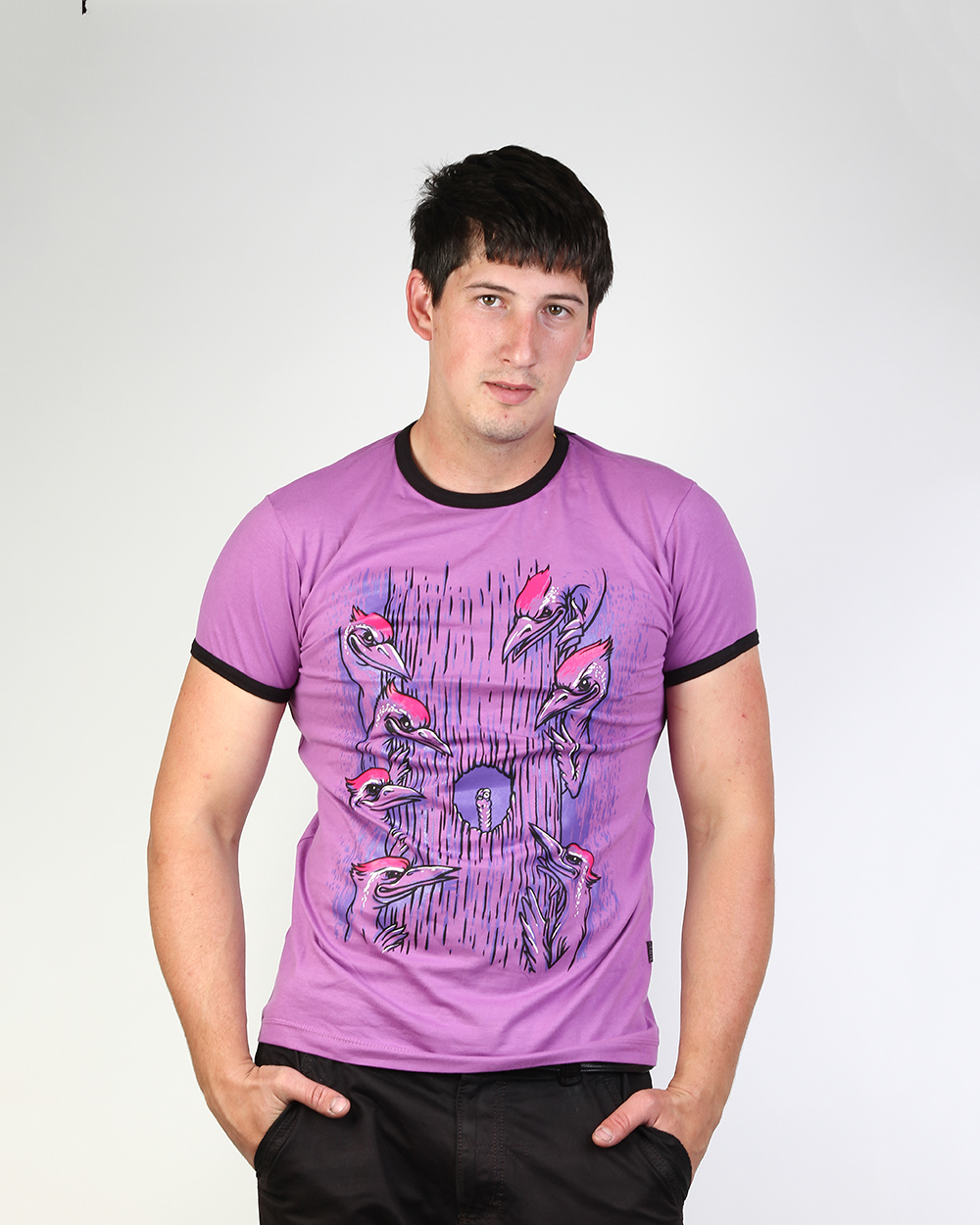 Благодаря необычному рисунку с птицами, эта модель будет очень выигрышно смотреться на мужской фигуре. Яркий сиреневый цвет и черная окантовка по краям выгодно отличают эту футболку, а легкая хлопковая ткань приятна телу.