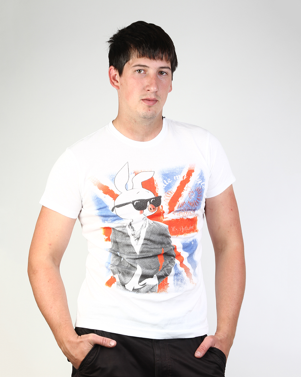 Футболка белого цвета с оригинальным принтом мультяшного персонажа Пятачка отлично дополнит коллекцию мужских футболок. Модель сделана из натурального хлопка, который приятен телу и обладает эластичностью.