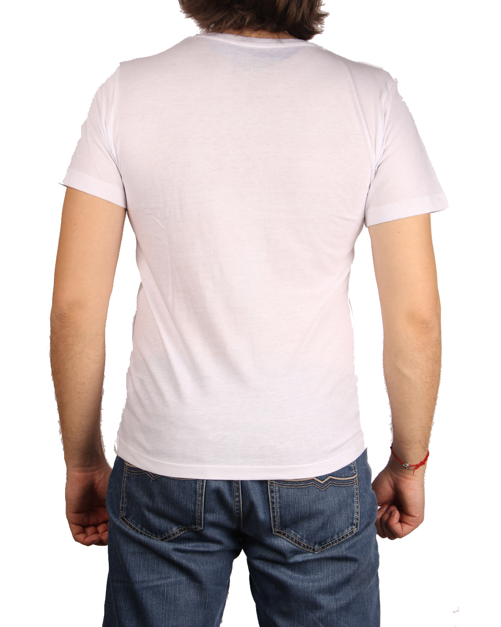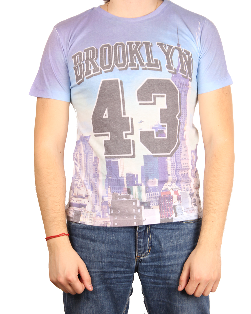 Мужская футболка оригинальной расцветки и принтом с изображением Бруклина. Перед исполнен в бело-фиолетовых цветах. Спинка однотонного белого цвета. Отличное дополнение весенне-летнего гардероба.