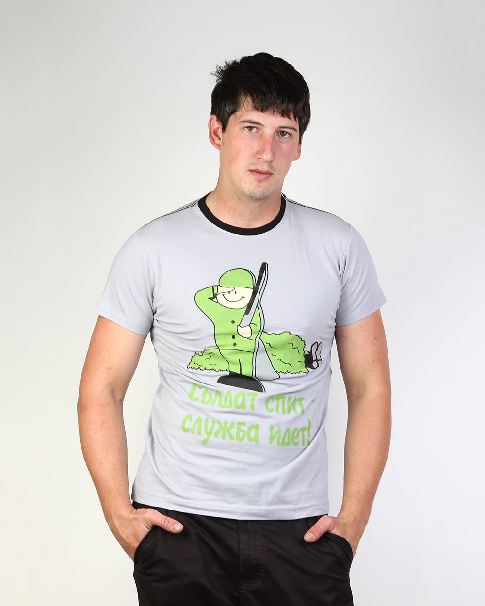 Эта футболка особенно понравится молодым людям, которые служили или собираются проходить службу в армии. Приятный белый цвет и многозначительный буквенный принт придают футболке оригинальность и необычность.