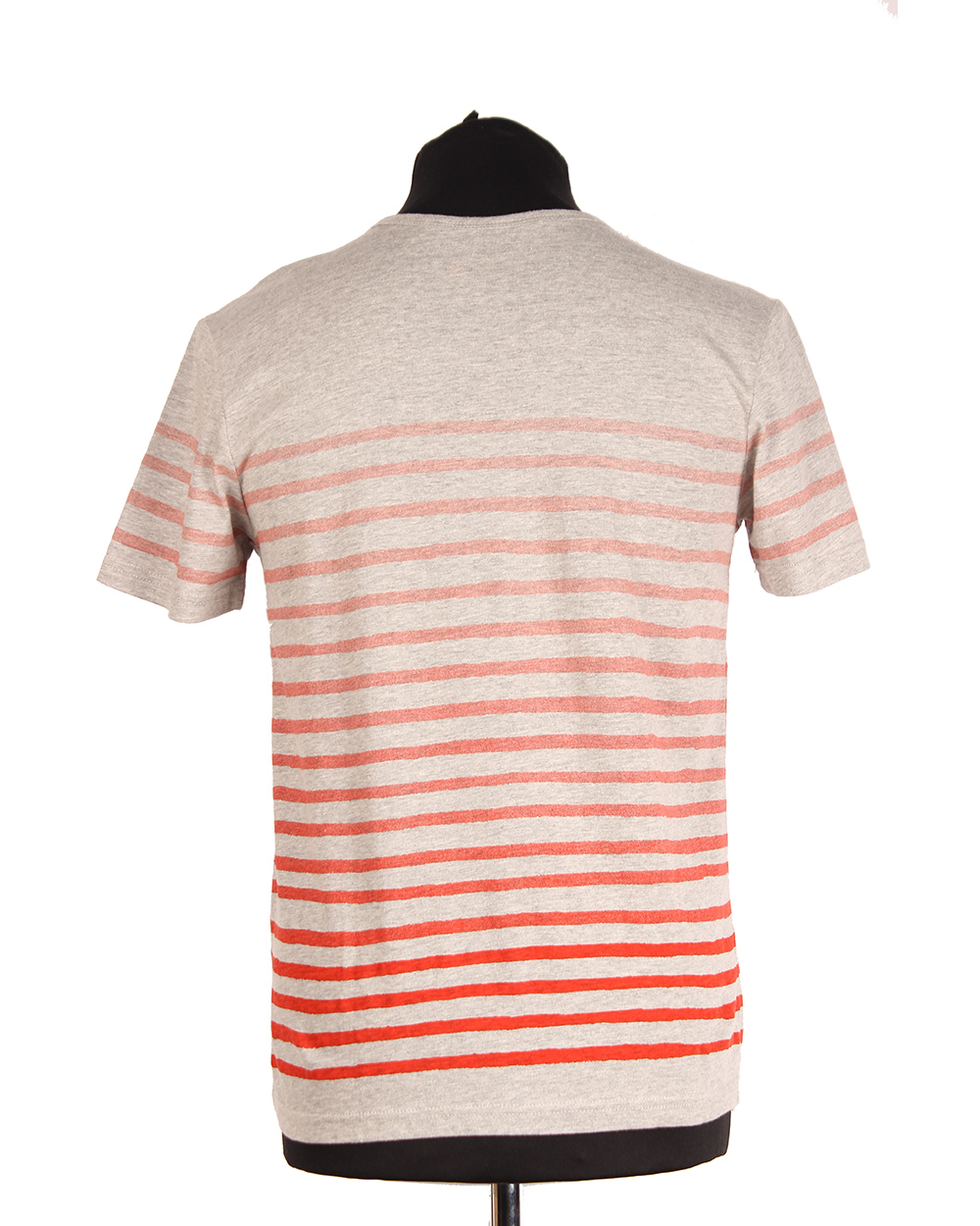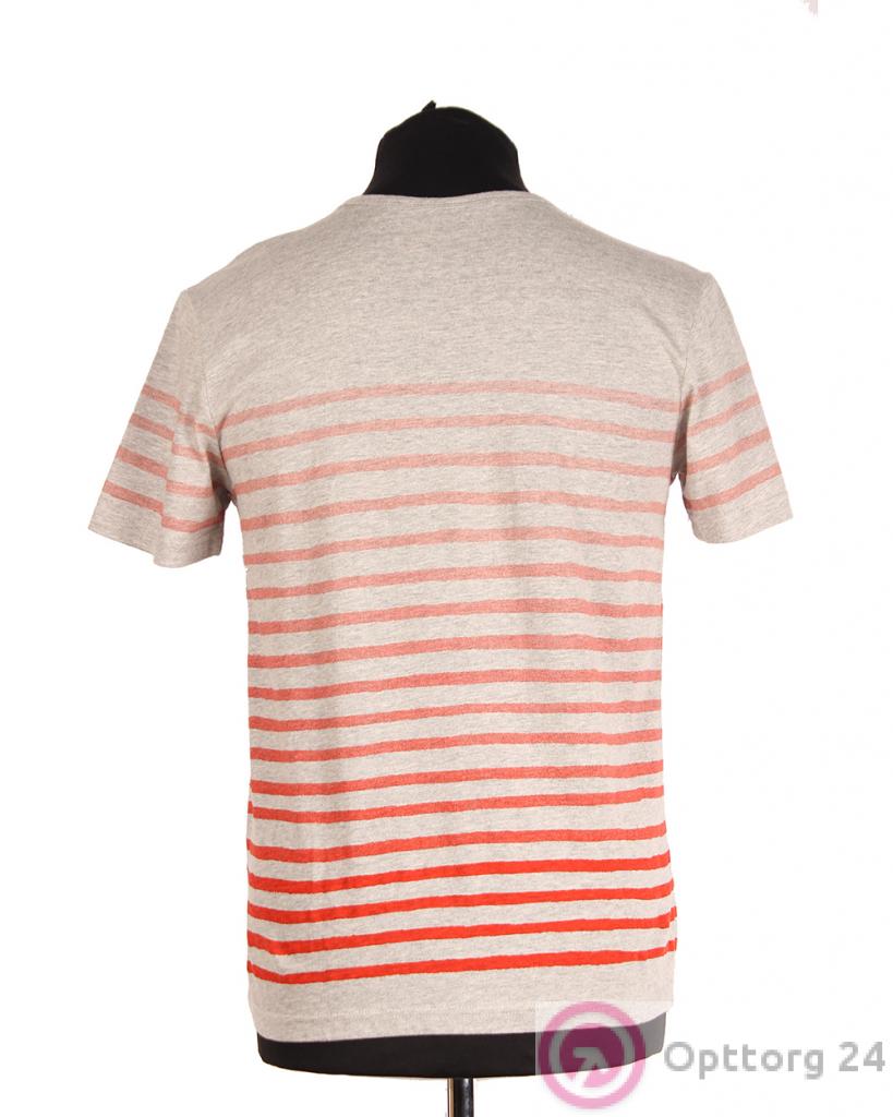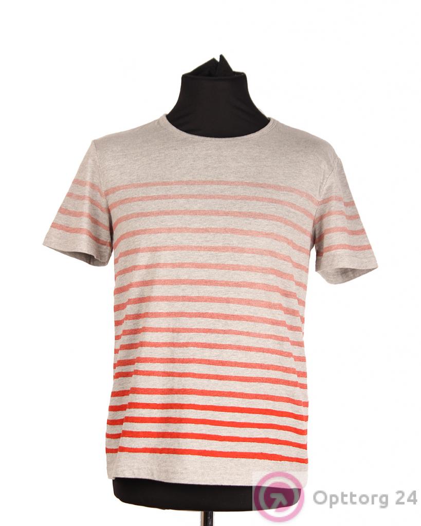 Стильная и комфортная футболка, представлена в цвете серый меланж. По всей модели горизонтальные полоски красного цвета, которые стают более насыщенными сверху вниз. Оптимальный вариант для носки каждый. день. Сток из Англии.
