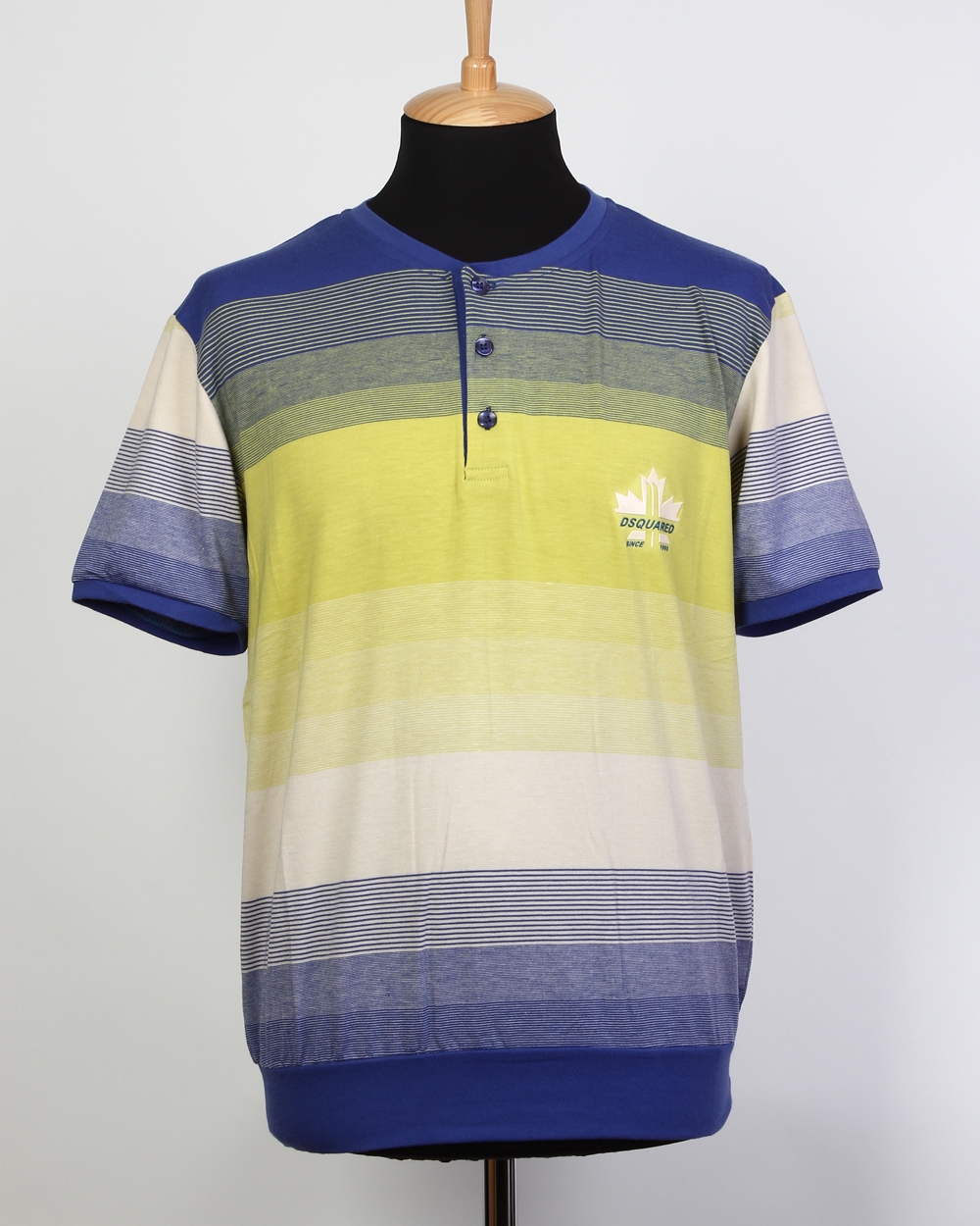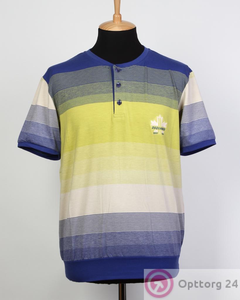 Веселая сине-желтая футболка в яркую полоску отлично смотрится на мужской фигуре и приятно облегает тело. Свободный покрой модели не стесняет движений.