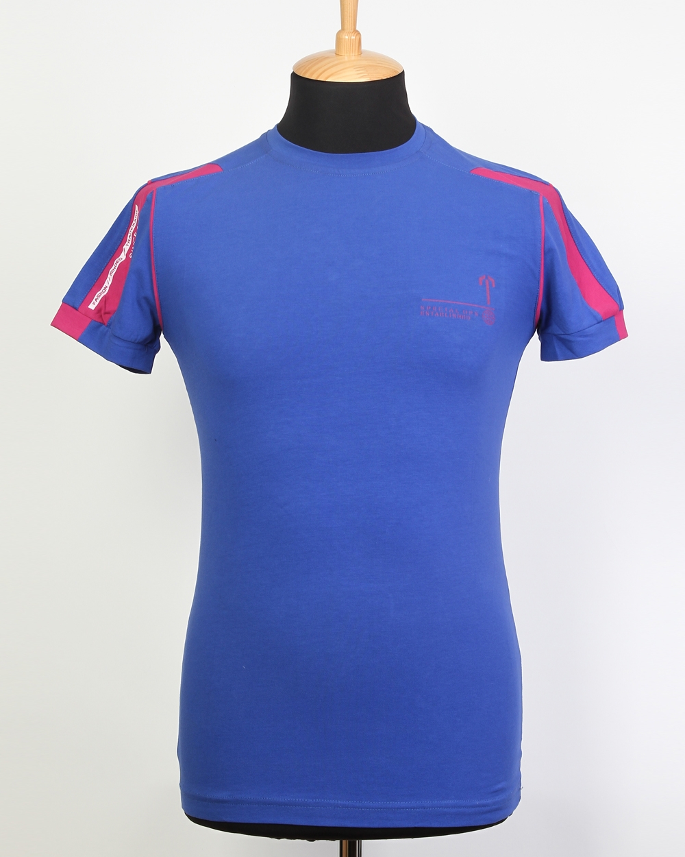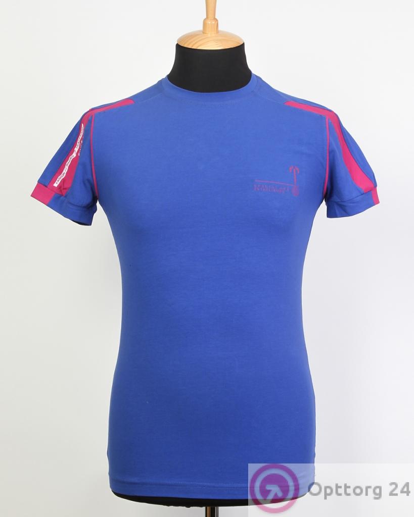 Приятная на ощупь футболка синего цвета оригинально смотрится засчет красных полосок. В ней вы будете чувствовать себя комфортно и удобно в любом месте и в любое время.