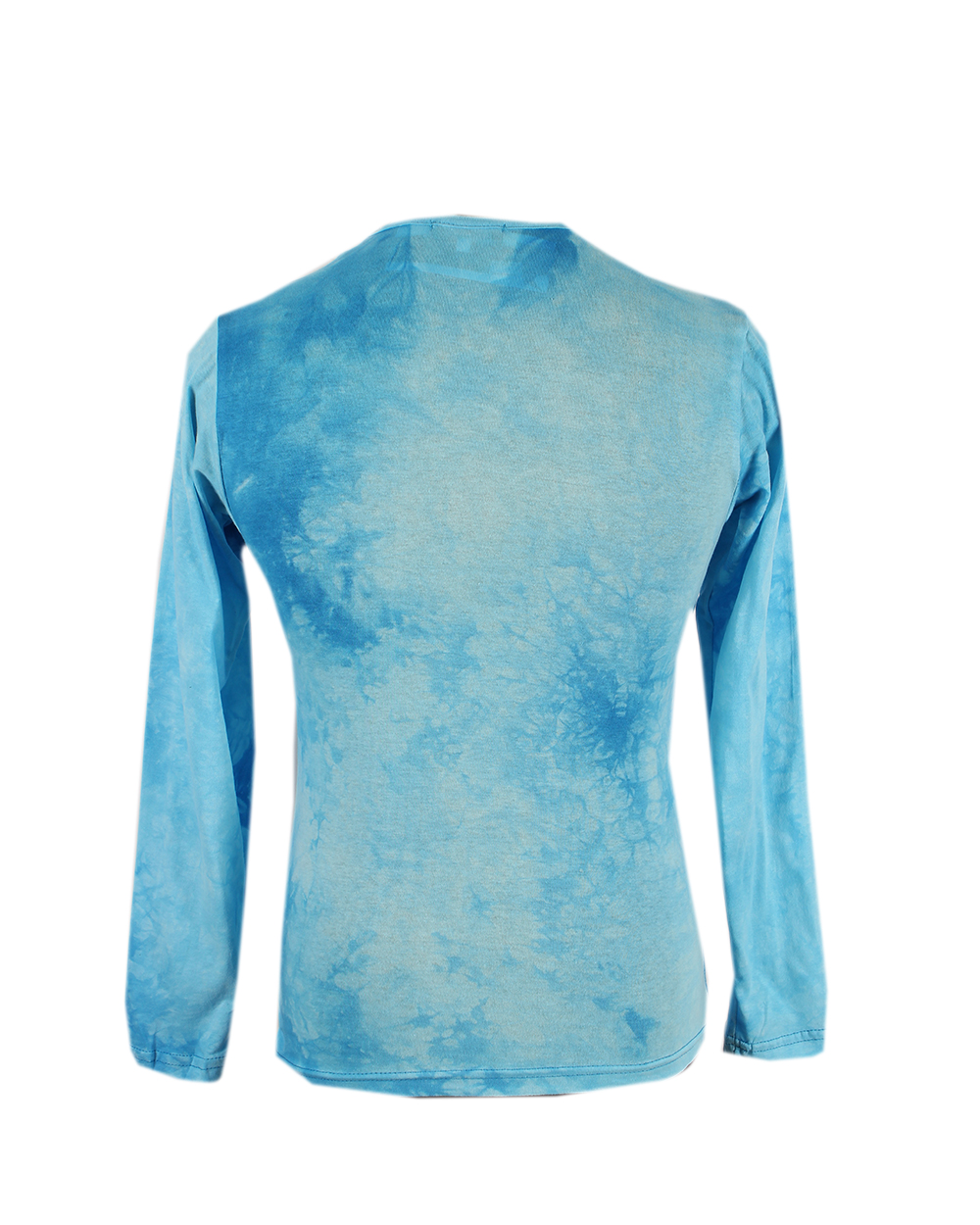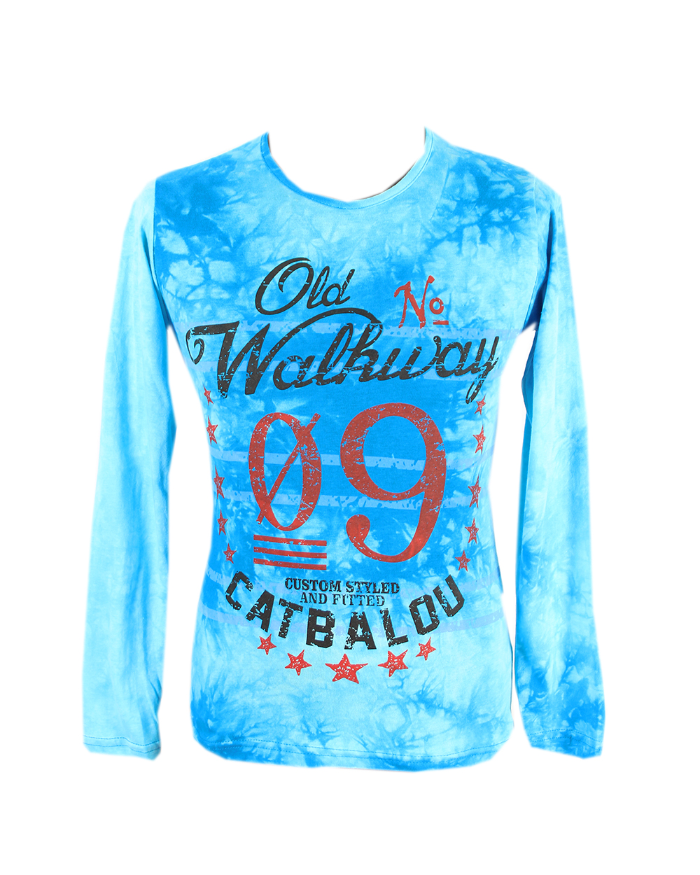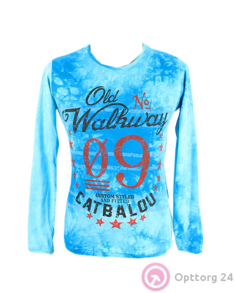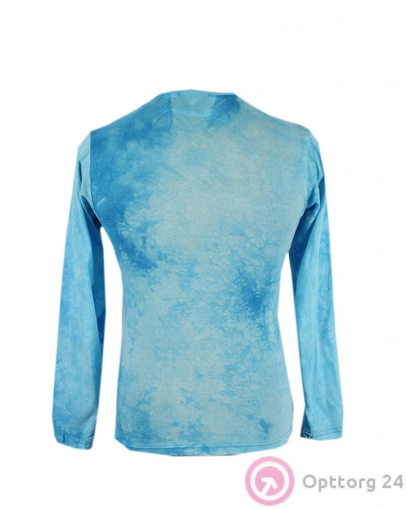 Мужская футболка голубого цвета с рисунком-разводамы. Облегающий крой, округлая горловина, длинные рукава.