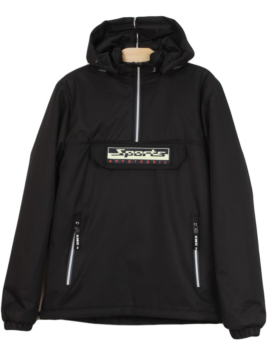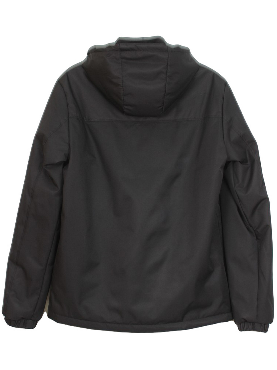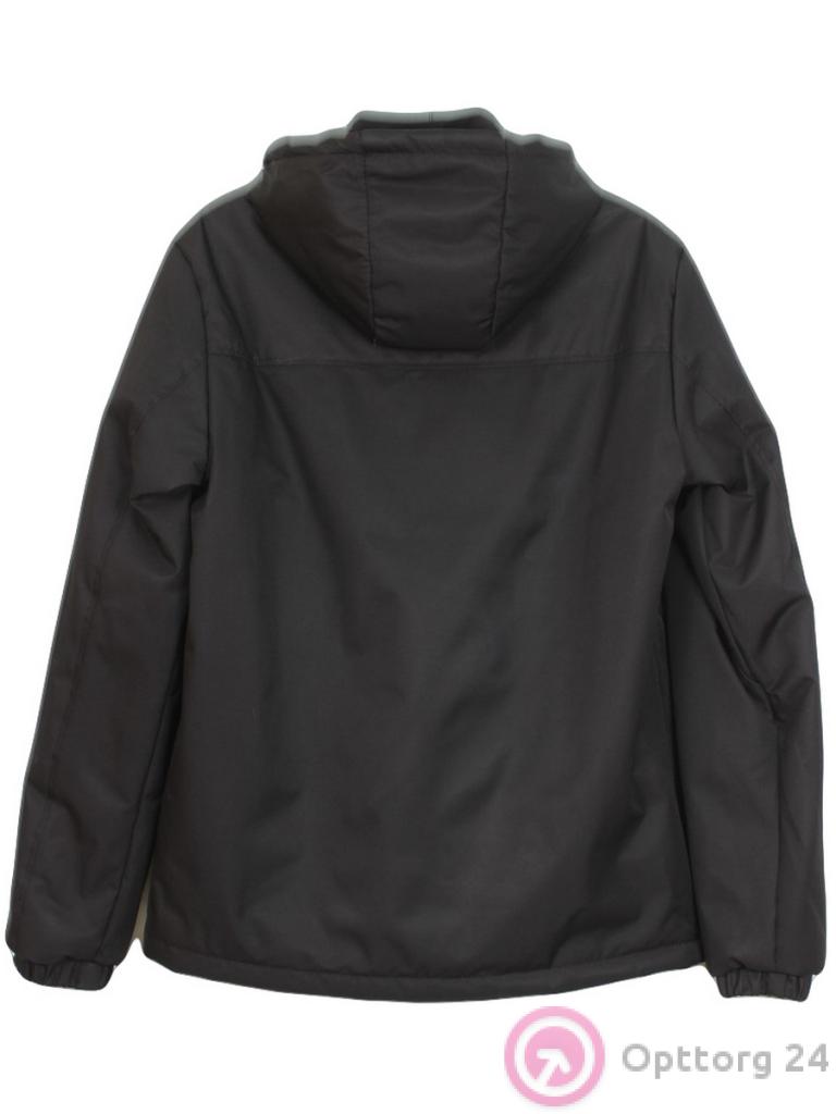 Черная демисезонная куртка для мужчины, имеет короткую длину. Модель с капюшоном и карманами. Рукава снизу на резинке.