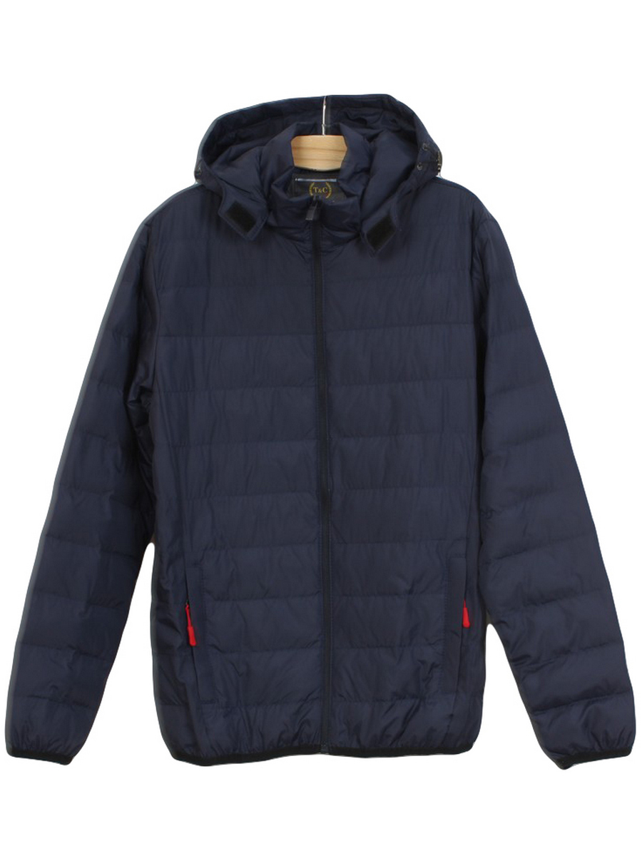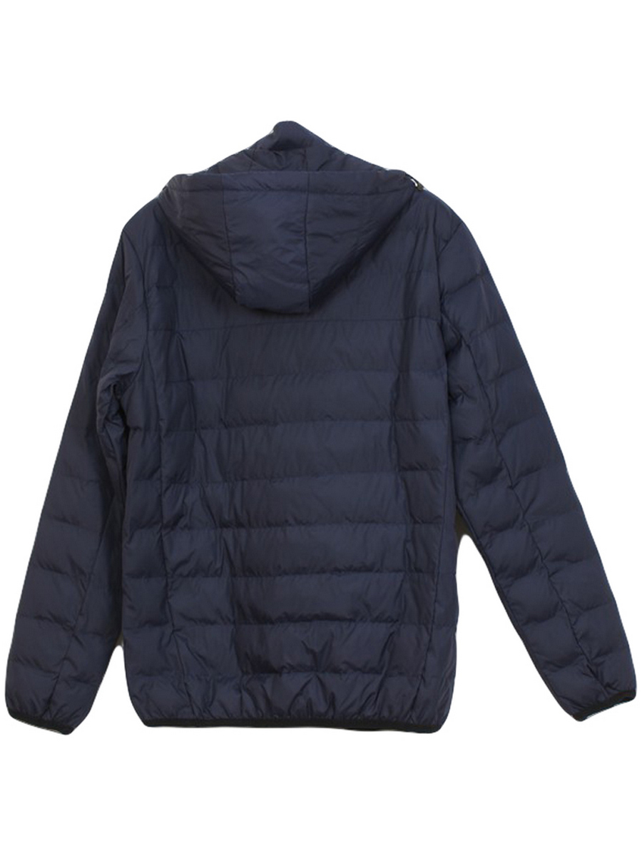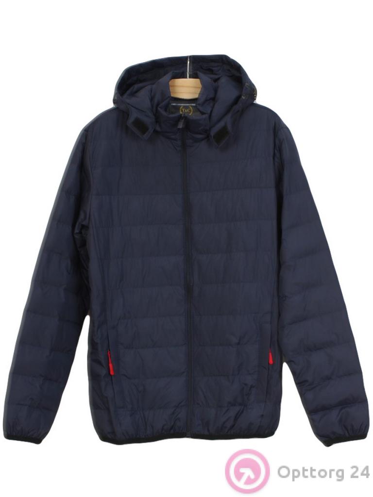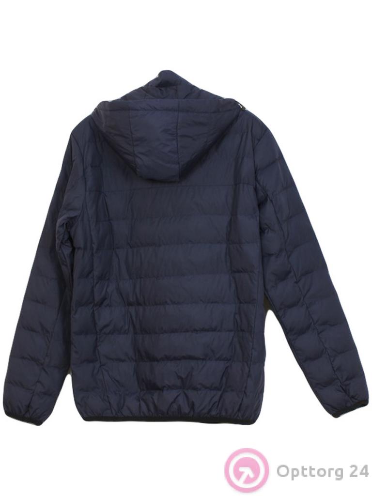 Короткая куртка для мужчины синего цвета с карманами и капюшоном. Классическая модель свободного кроя. По середине молния в цвет.