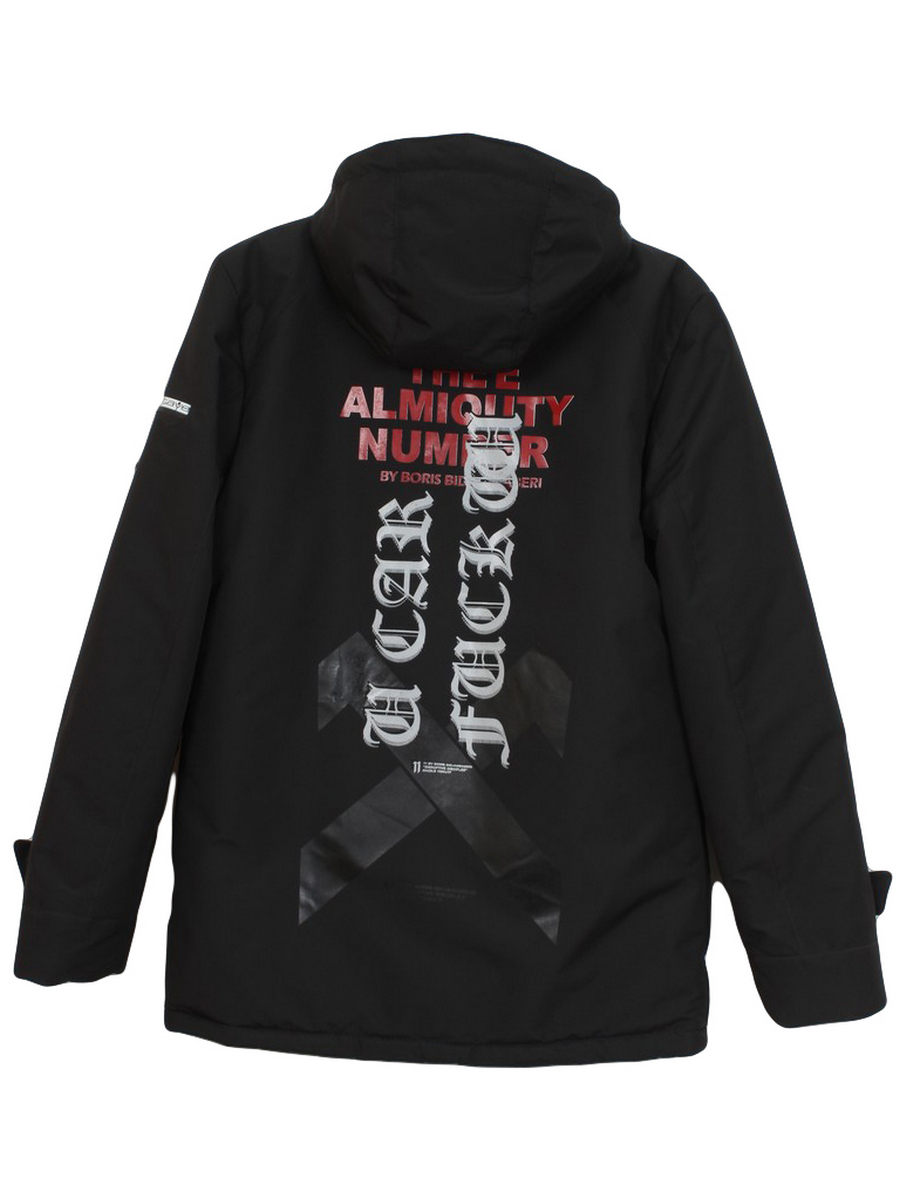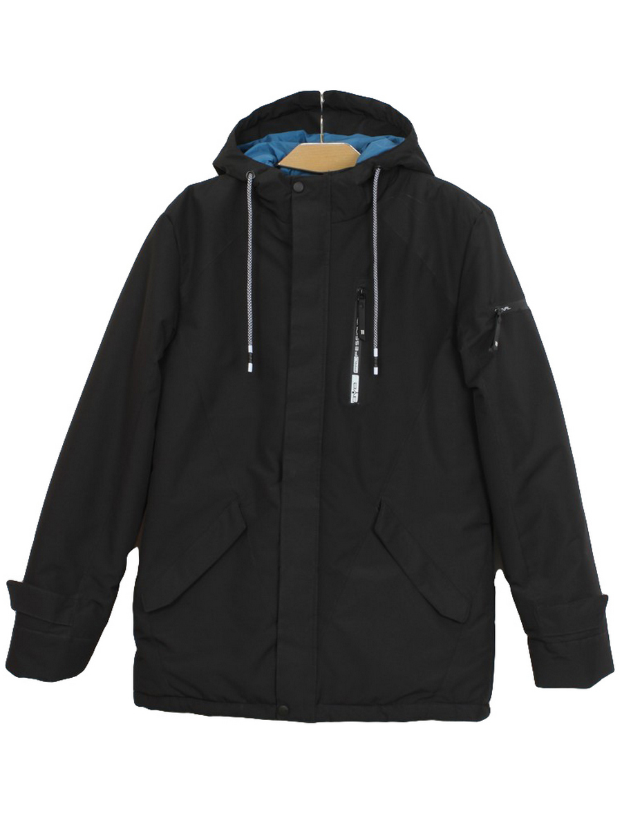 Черная демисезонная куртка для мужчины длиной выше колена. Модель имеет свободный крой. Спереди изделия и на рукаве имеются карманы. Подкладка куртки синего цвета.