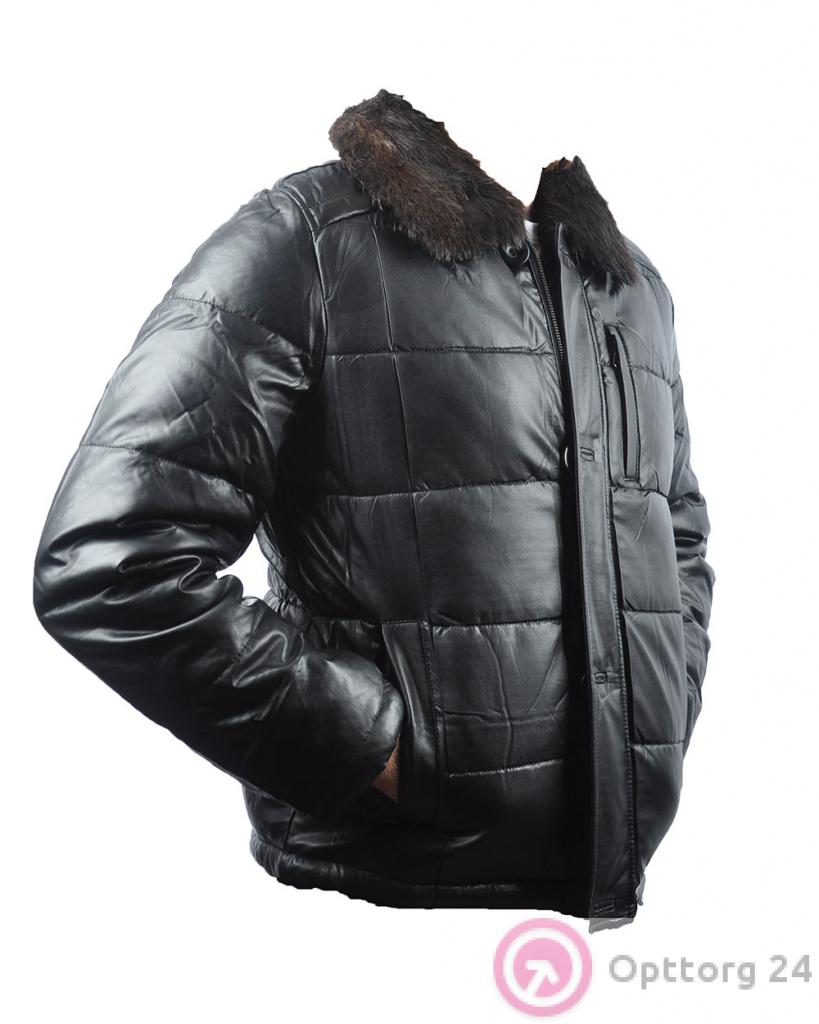 Куртка мужская черного цвета под кожу с меховой опушкой оптом
