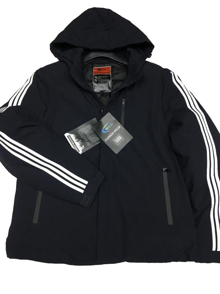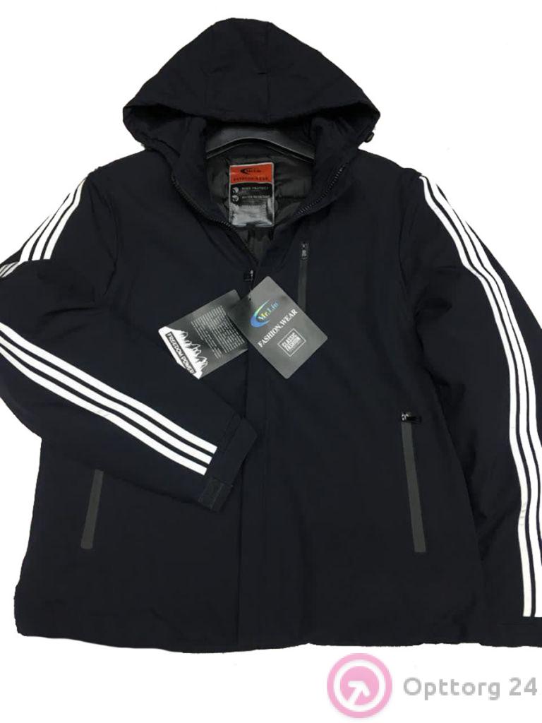 Описание: Куртка мужская демисезонная цвет черный на рукавах три белых полоски. Застежка на молнии с ветрозащитной планкой на кнопках. Есть три кармана на молнии и капюшон. Высокий воротник. Манжеты рукавов регулируются на липучке.