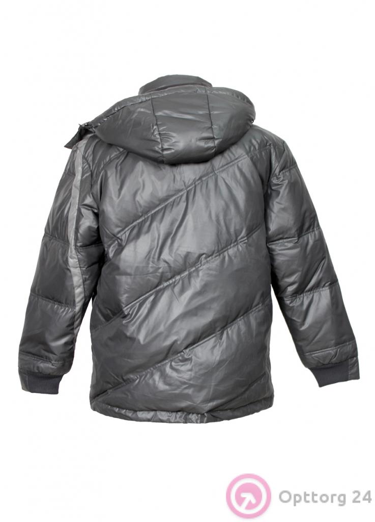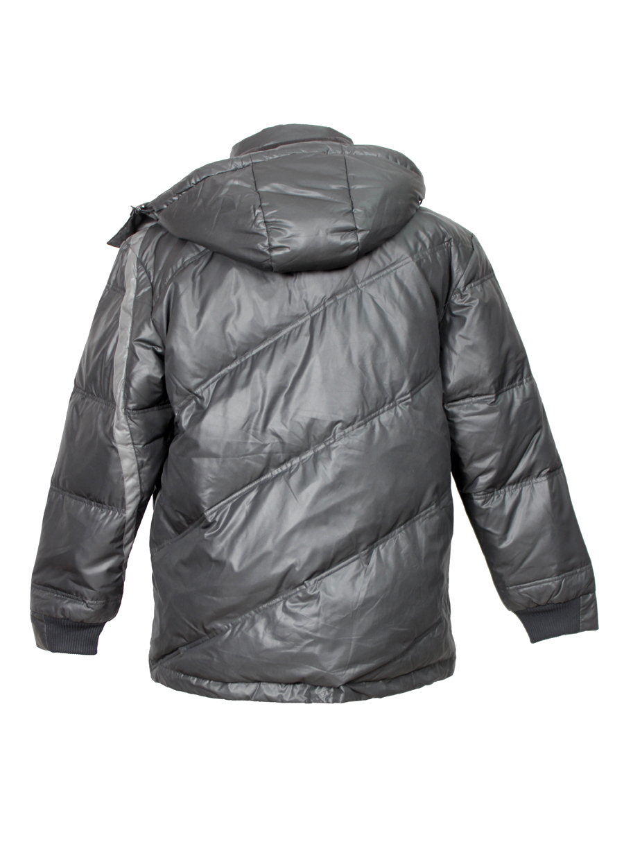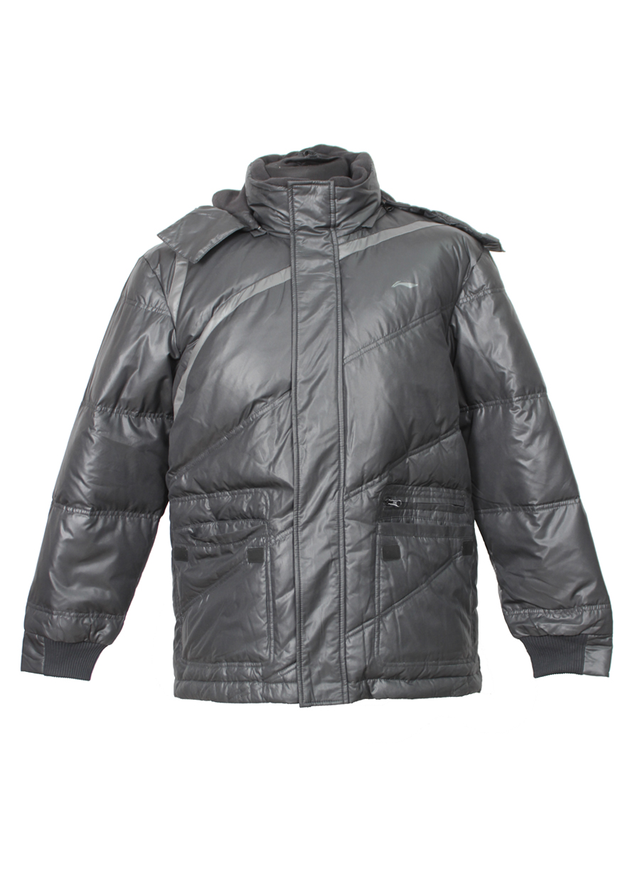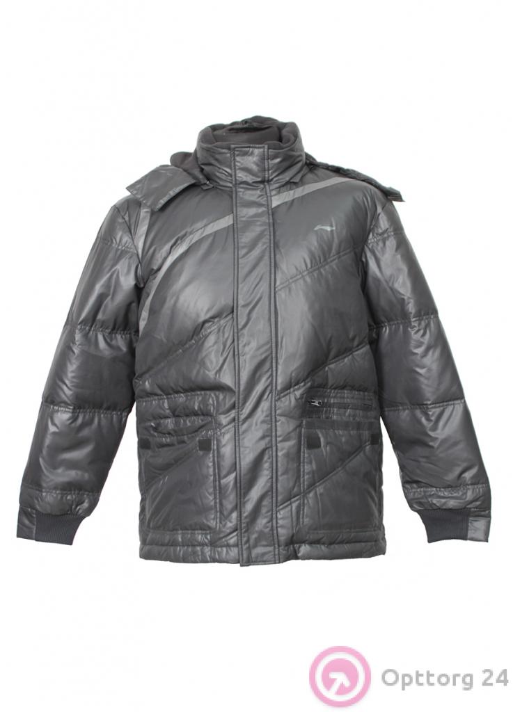 Мужская куртка черного цвета демисезонная. Имеет украшение-всатвки в виде серых линий, большие карманы и капюшон
