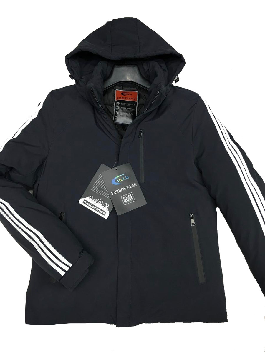Описание: Куртка мужская демисезонная цвет мокрый асфальт, на рукавах три белых полоски. Застежка на молнии с ветрозащитной планкой на кнопках. Есть два кармана на молнии и капюшон. Высокий воротник. Манжеты рукавов регулируются на липучке.