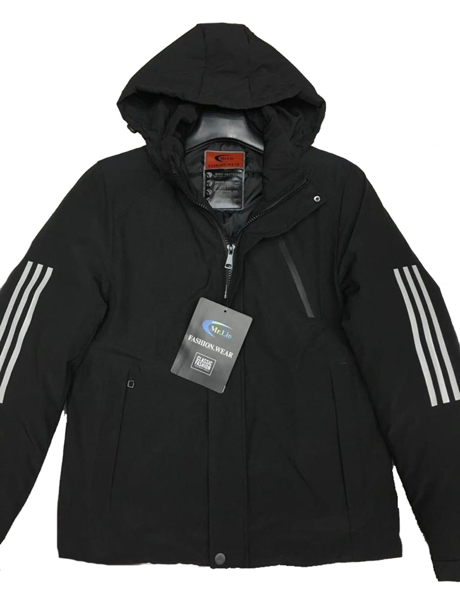 Описание: Куртка мужская демисезонная цвет черный. Застежка на молнии с ветрозащитной планкой на кнопках. Есть три кармана и капюшон. Высокий воротник. Манжеты рукавов регулируются на липучке.