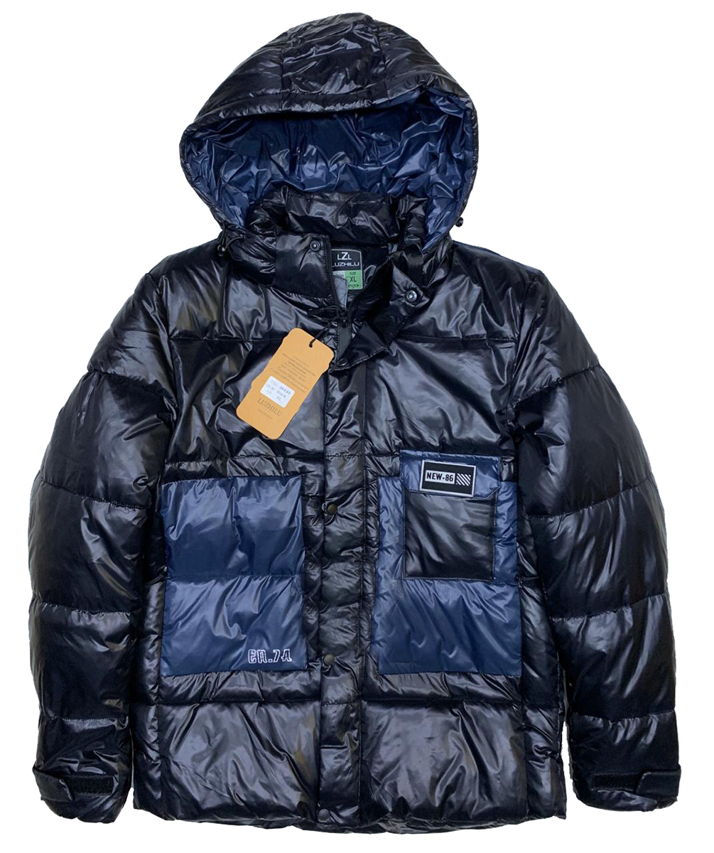 Куртка выполнена прямого кроя с вставками в виде квадрата синего цвета. Легкая и очень теплая.