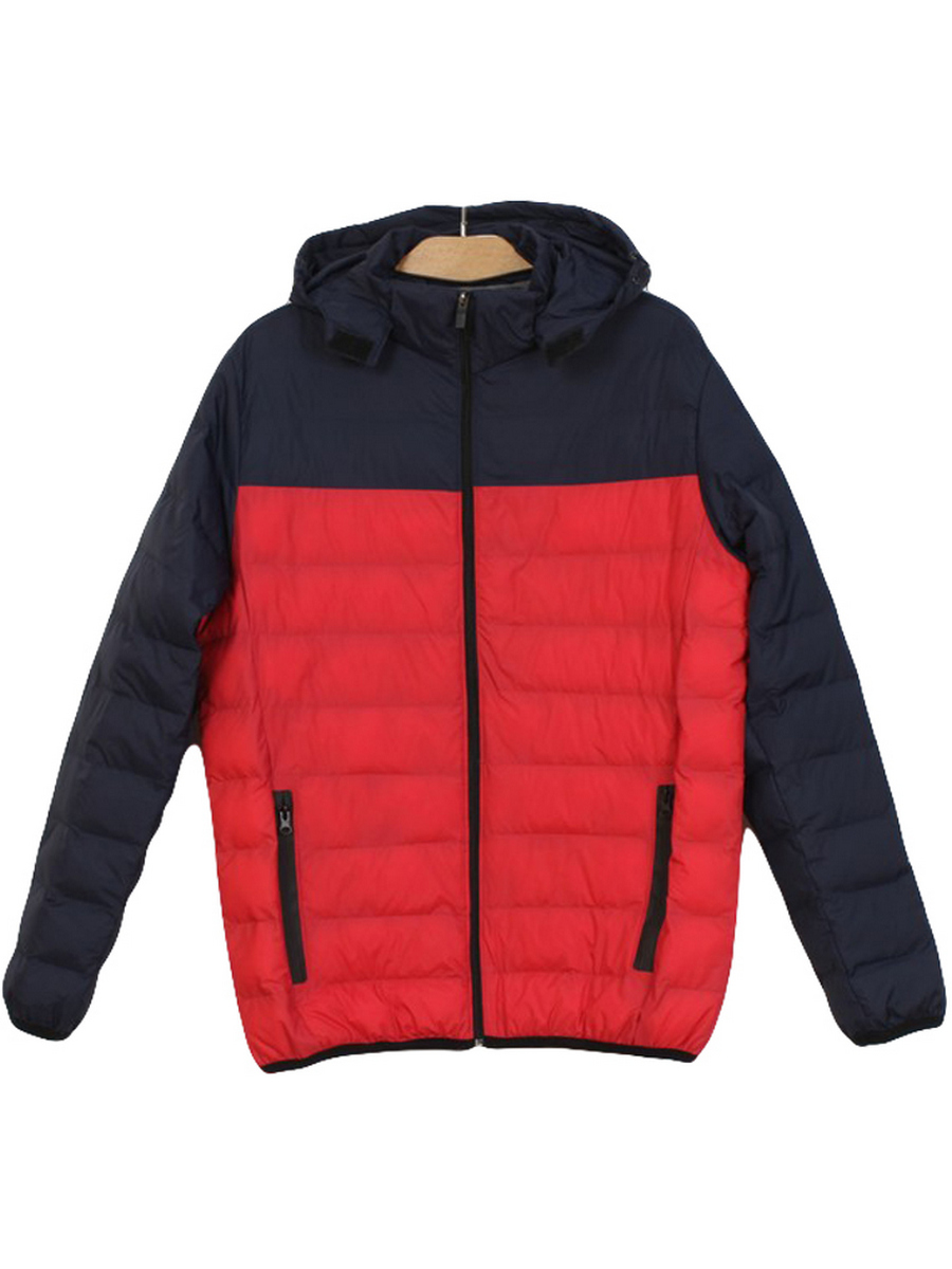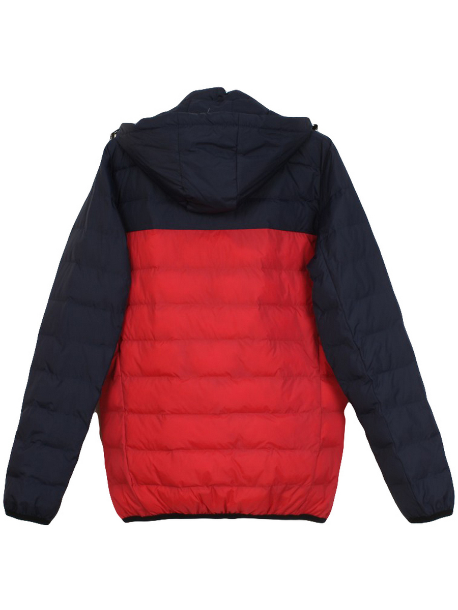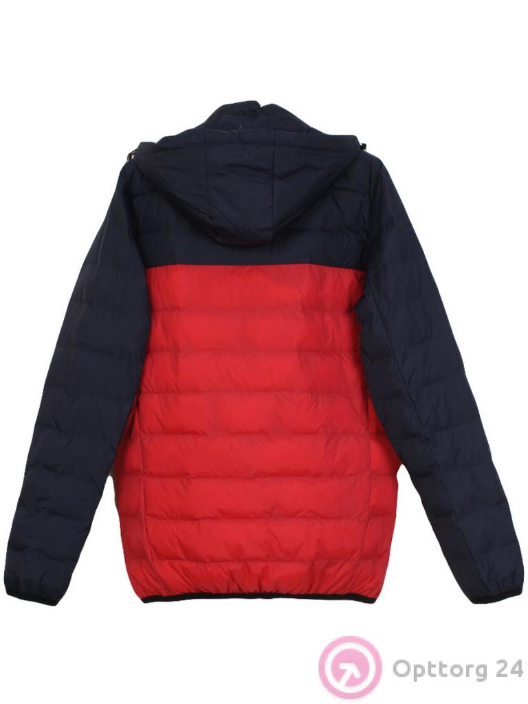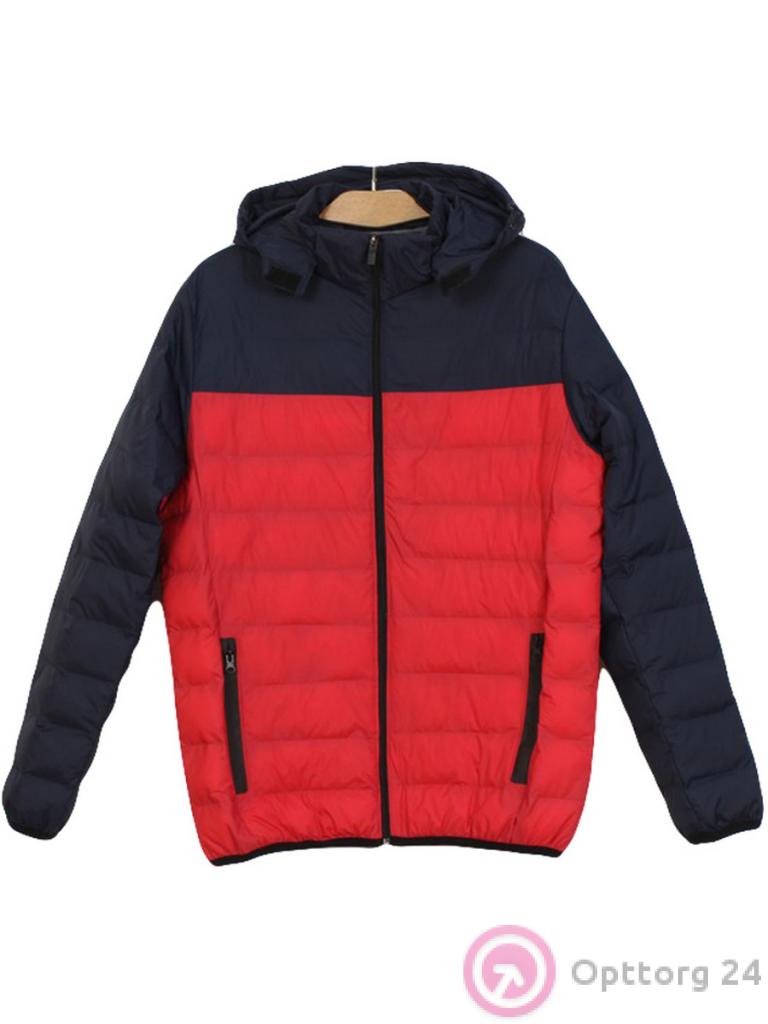 Удобная двухцветная куртка демисезонная для мужчины, снизу красного цвета, сверху синего. Изделие имеет капюшон и карманы. Застежка на молнии.