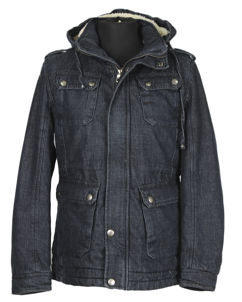 Стильная куртка темно-синего цвета под джинс. Есть капюшон, приталенный крой.