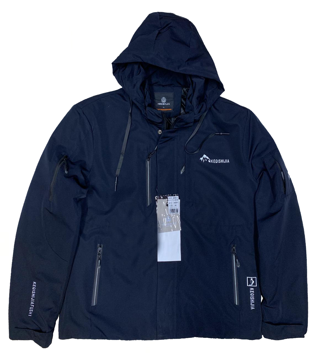 Есть четыре кармана на молнии, один нагрудный, один на рукаве.