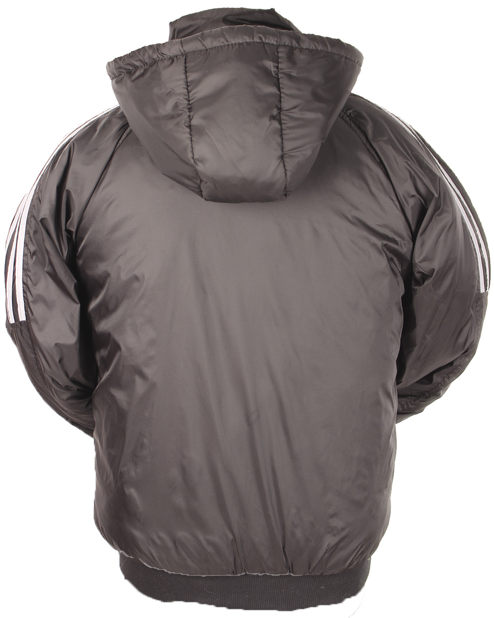 Мужская куртка на синтепоне, черного цвета. Модель на рукавах украшена тремя серыми полосками.