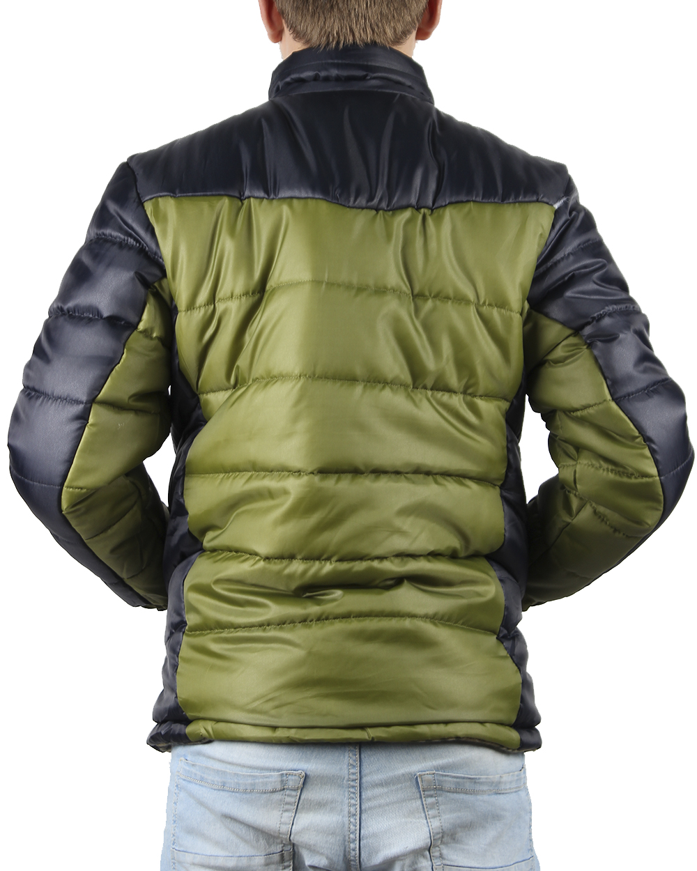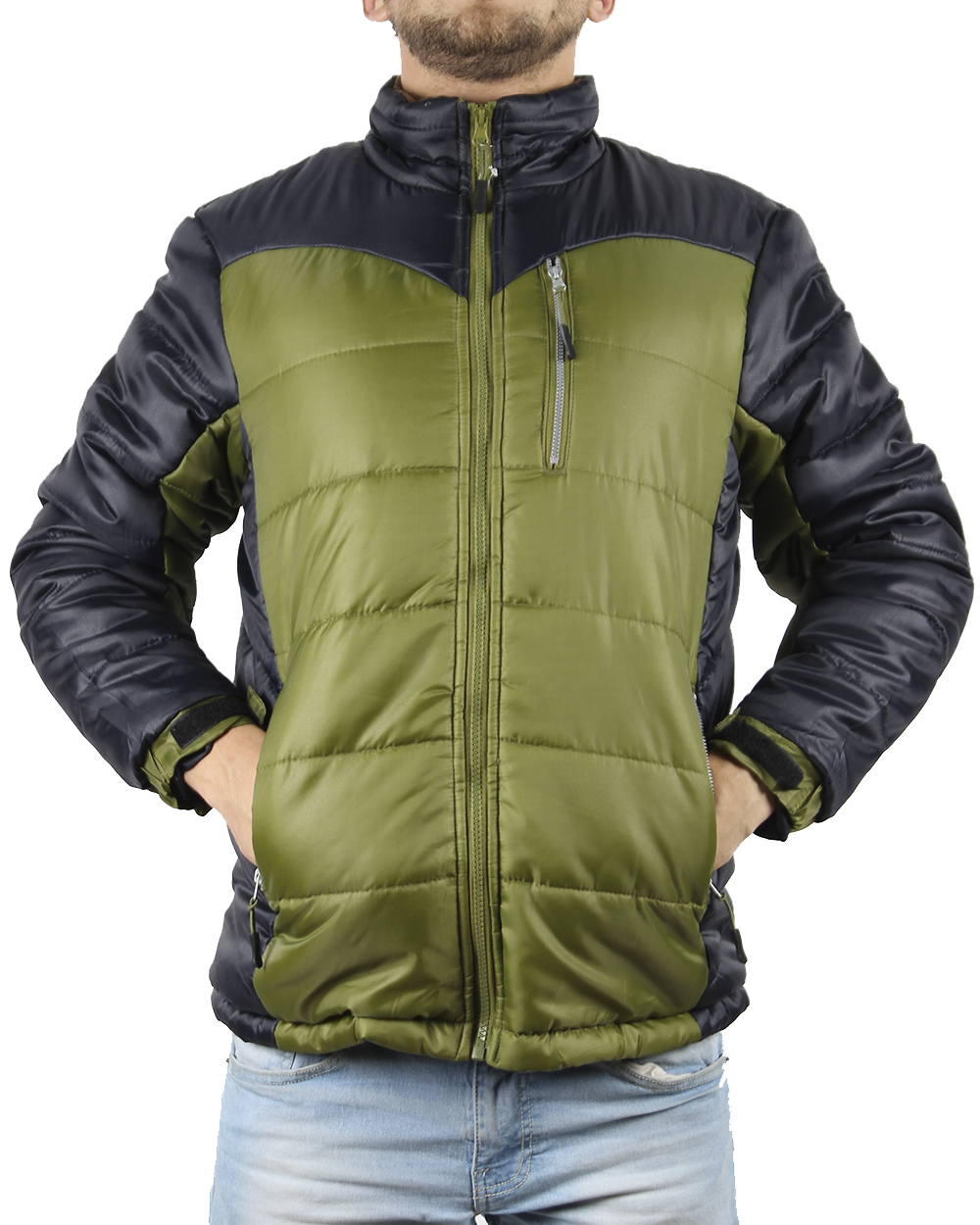 Мужская куртка ярко-зеленого цвета с черными рукавами. Модель имеет два передних и нагрудный карман.