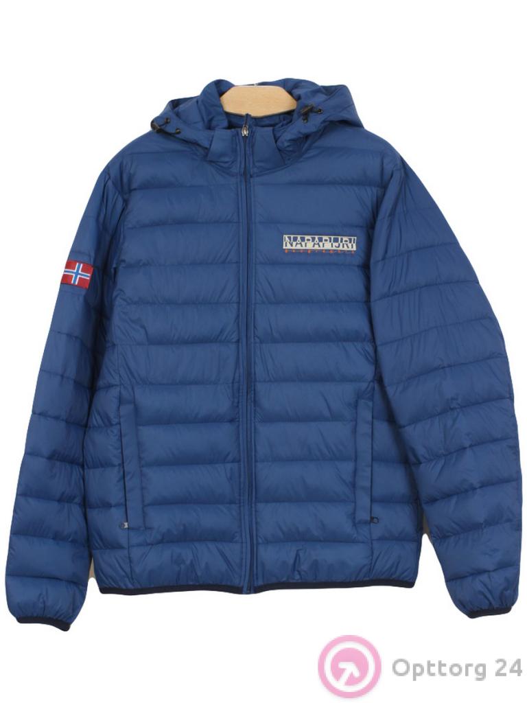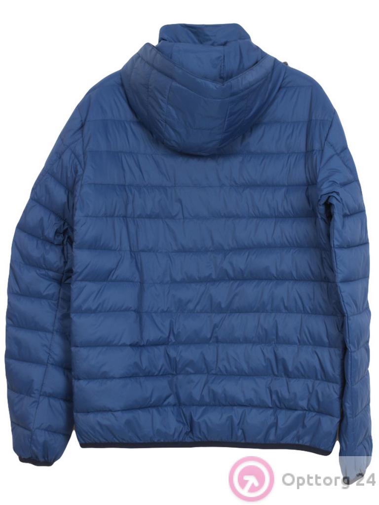 Куртка синего цвета для мужчины демисезонная свободного кроя. Модель имеет нашивку спереди и на рукаве. Изделие с капюшоном и карманами на молнии.