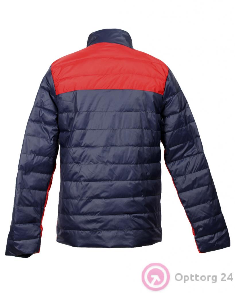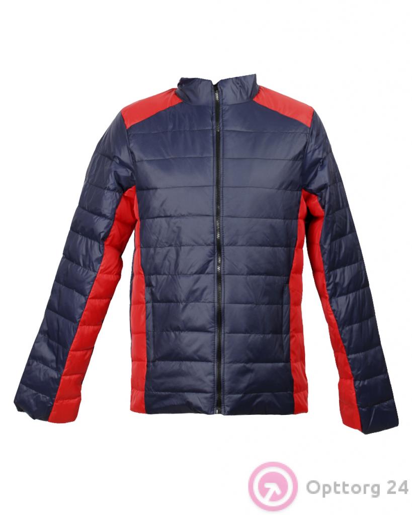 Синяя демисезонная мужская куртка на синтепоне. Изделие украшено красными вставками, имеет классический фасон и прекрасно защищает от непогоды