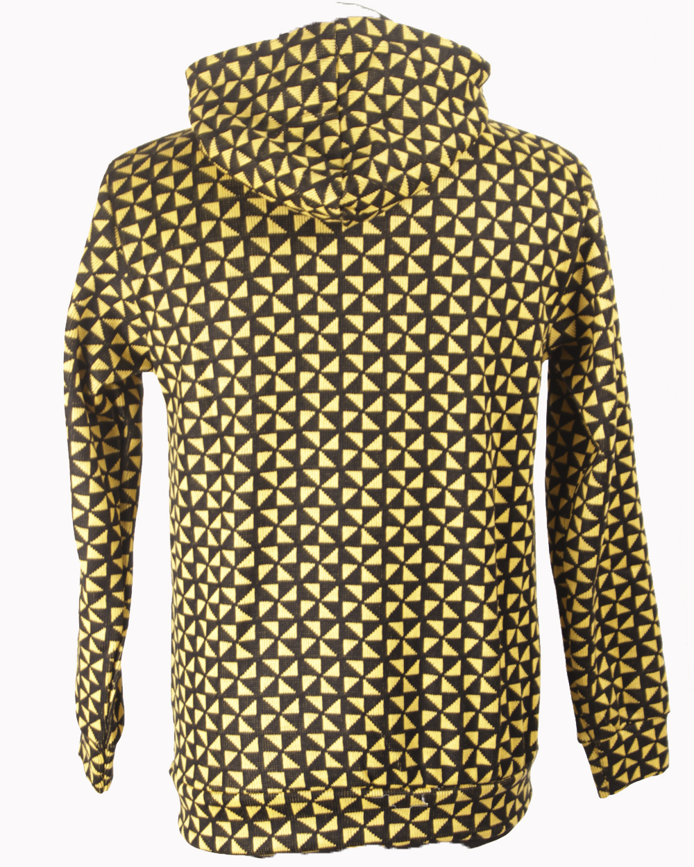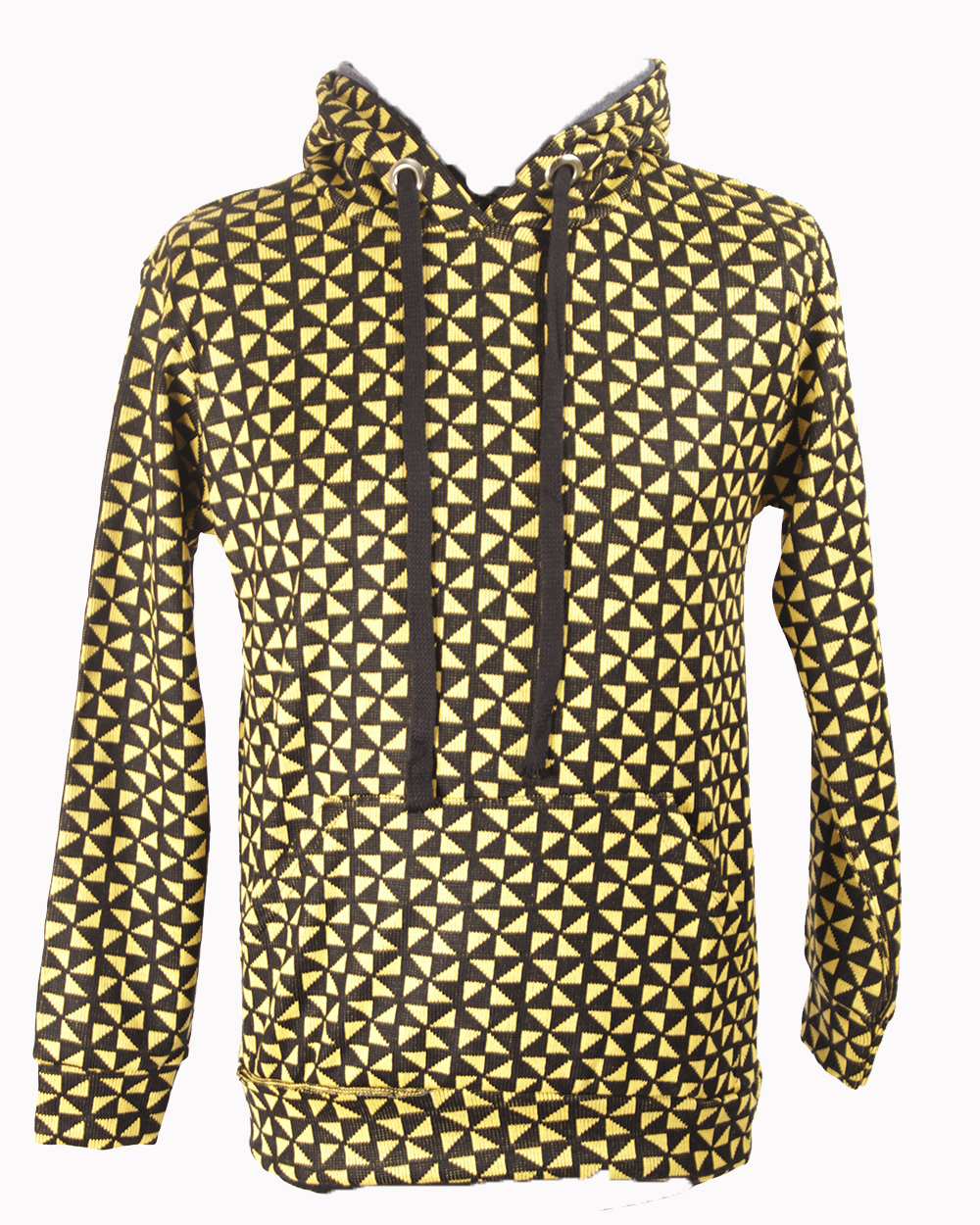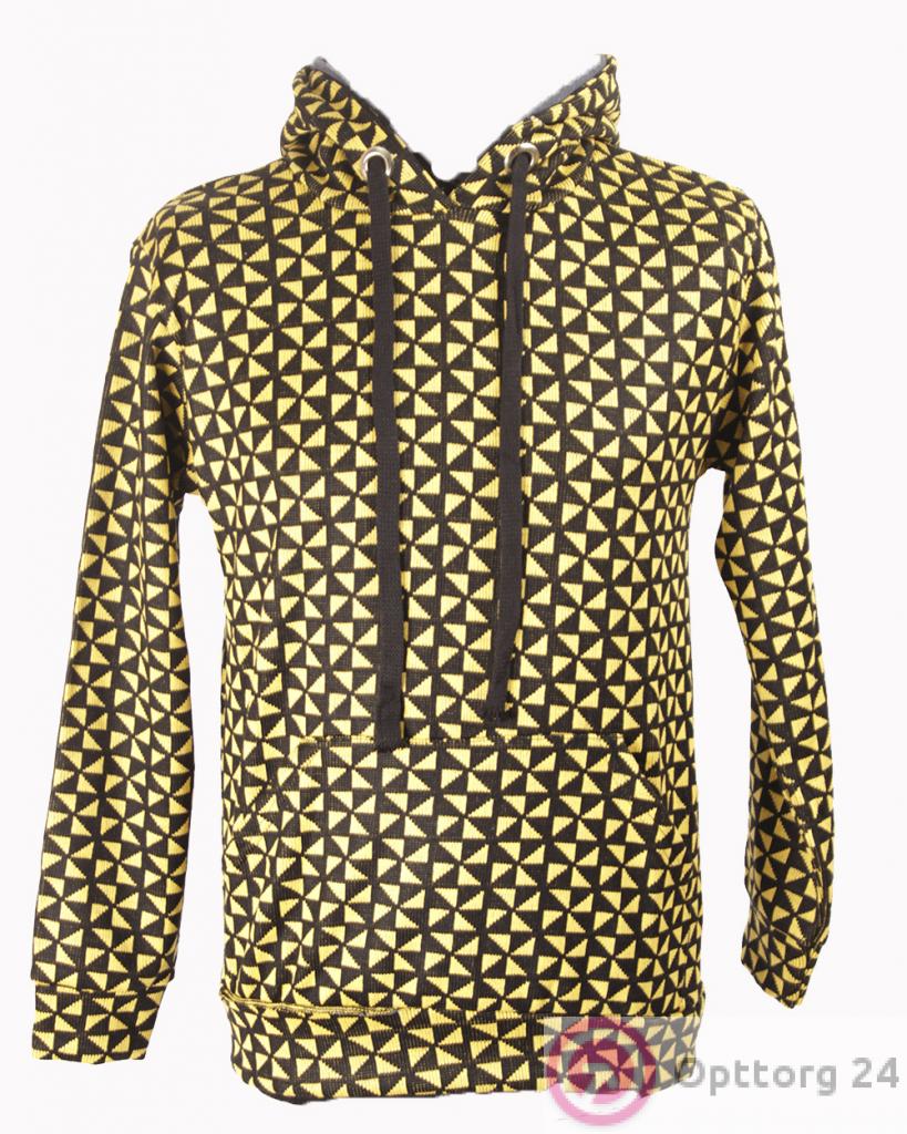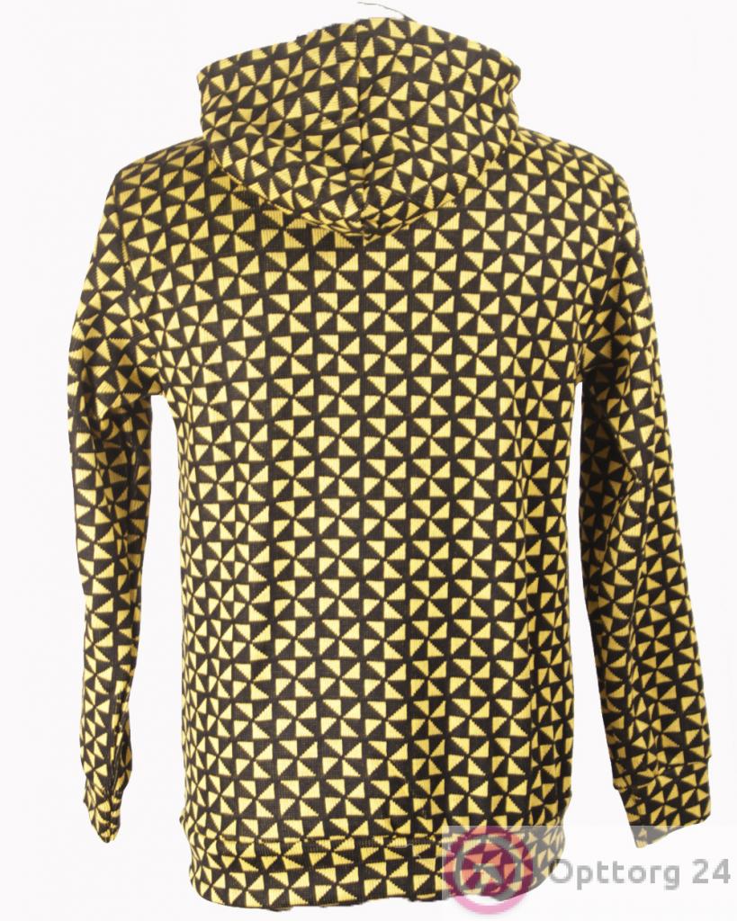 Мужская толстовка черного цвета в жёлтый геометрический треугольник желтого цвета. Стильная удобная модель с капюшоном.
