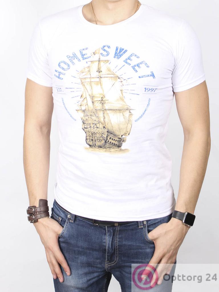 Футболка для мужчин, модель белого цвета с принтом в виде корабля.