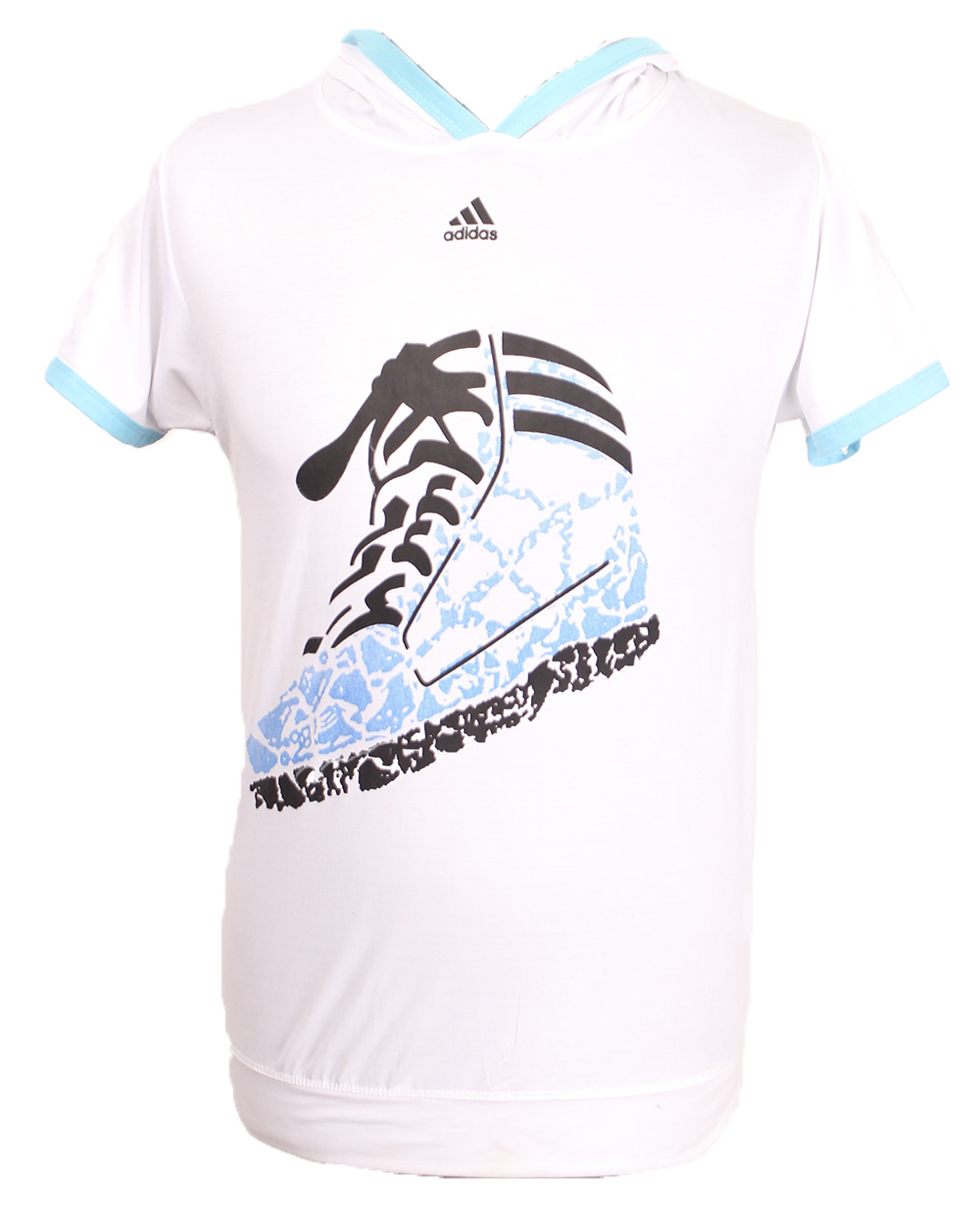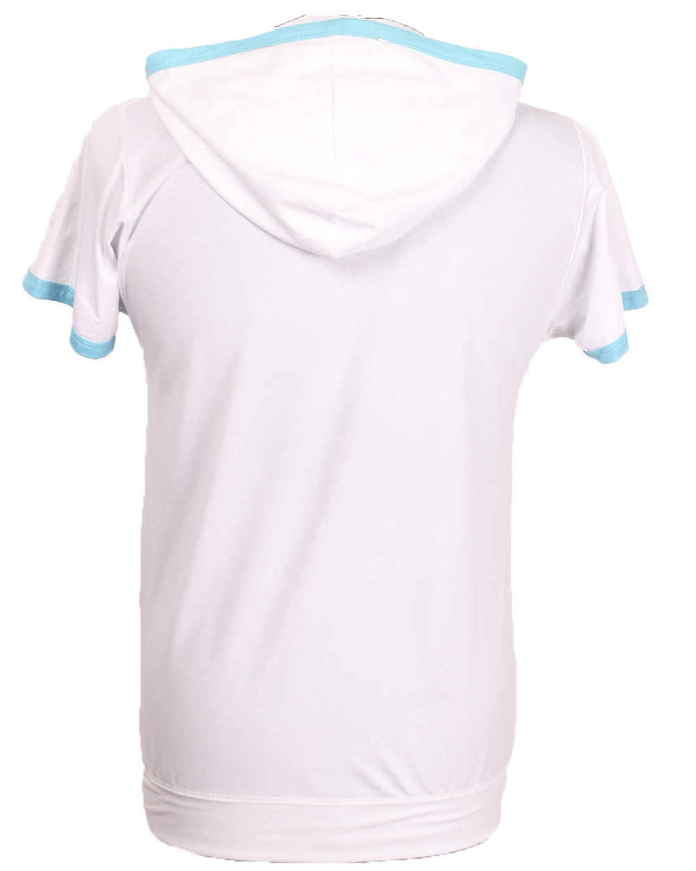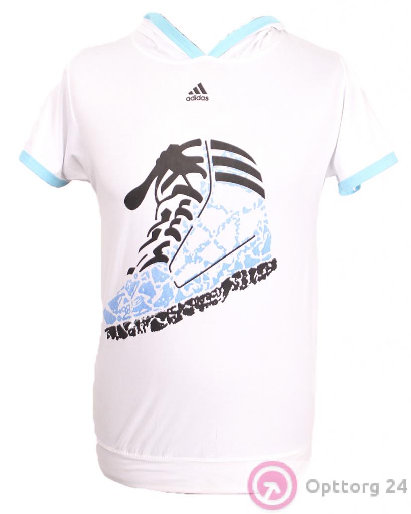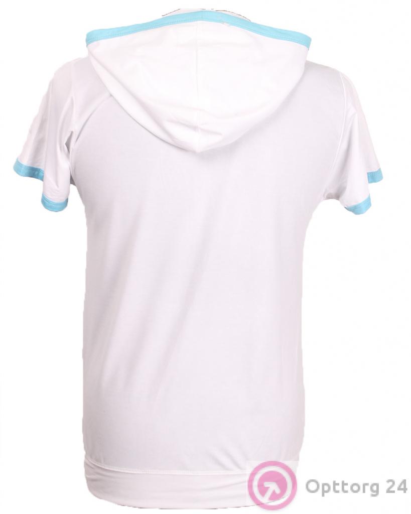 футболка мужская белого цвета на передней части изделия расположен принт в виде кросовка, на воротнике и рукавах яркая, голубая окантовка.