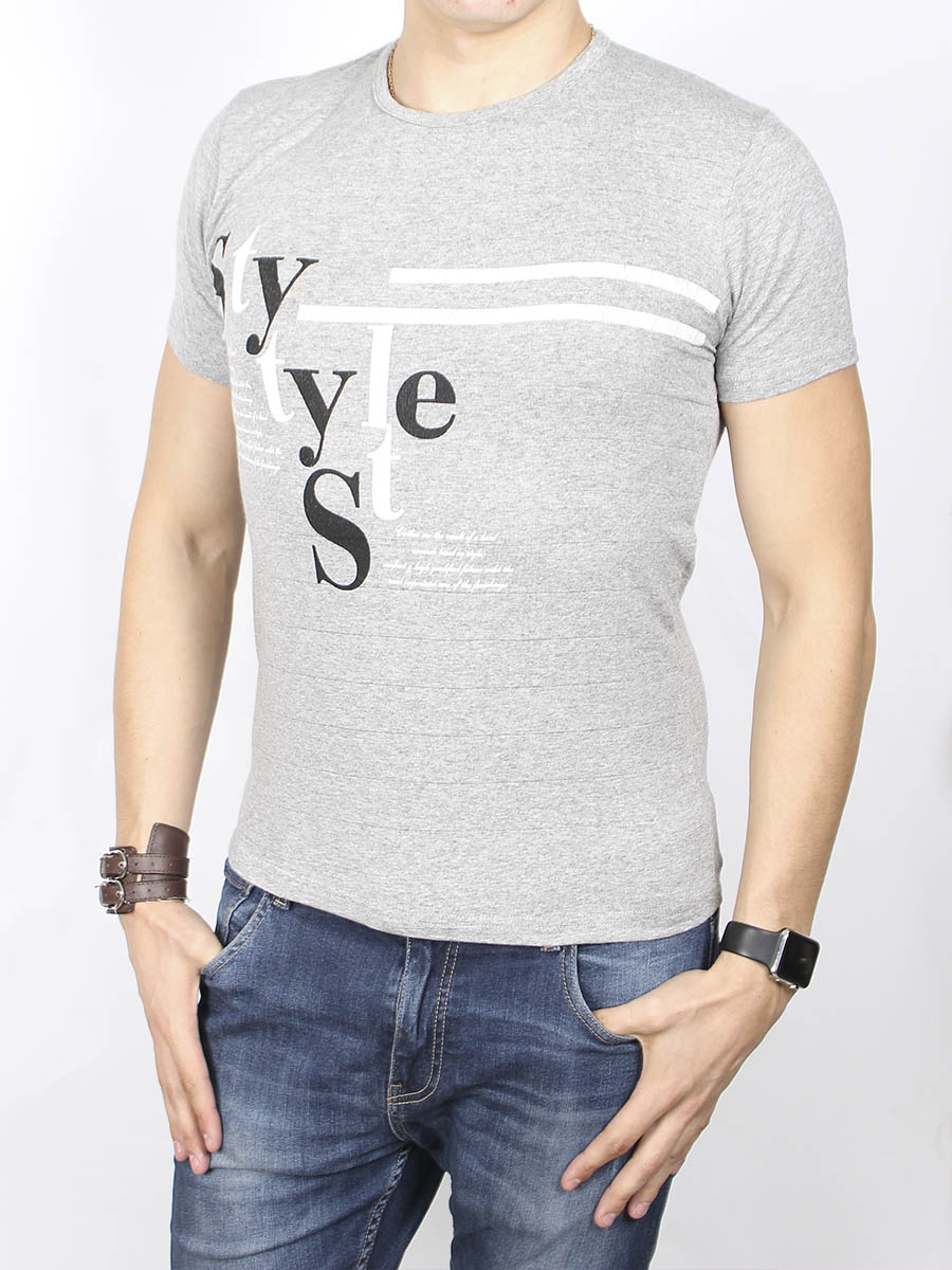 Футболка мужская серого цвета с принтом черно-белого цвета в виде надписи.