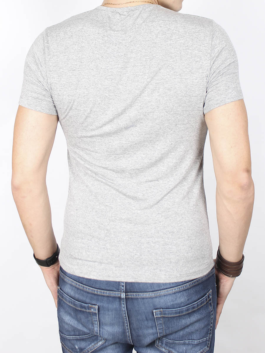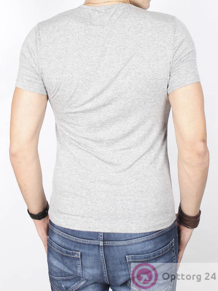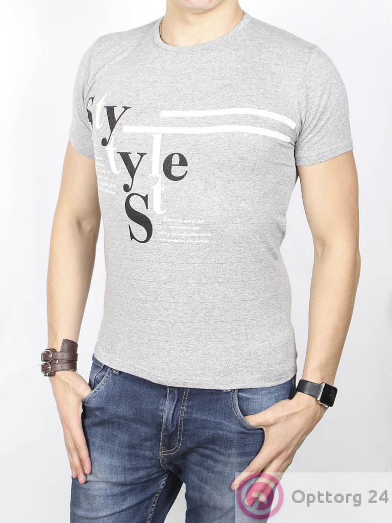 Мужская футболка серого цвета с черно-белым принтом на передней части изделия. оптом