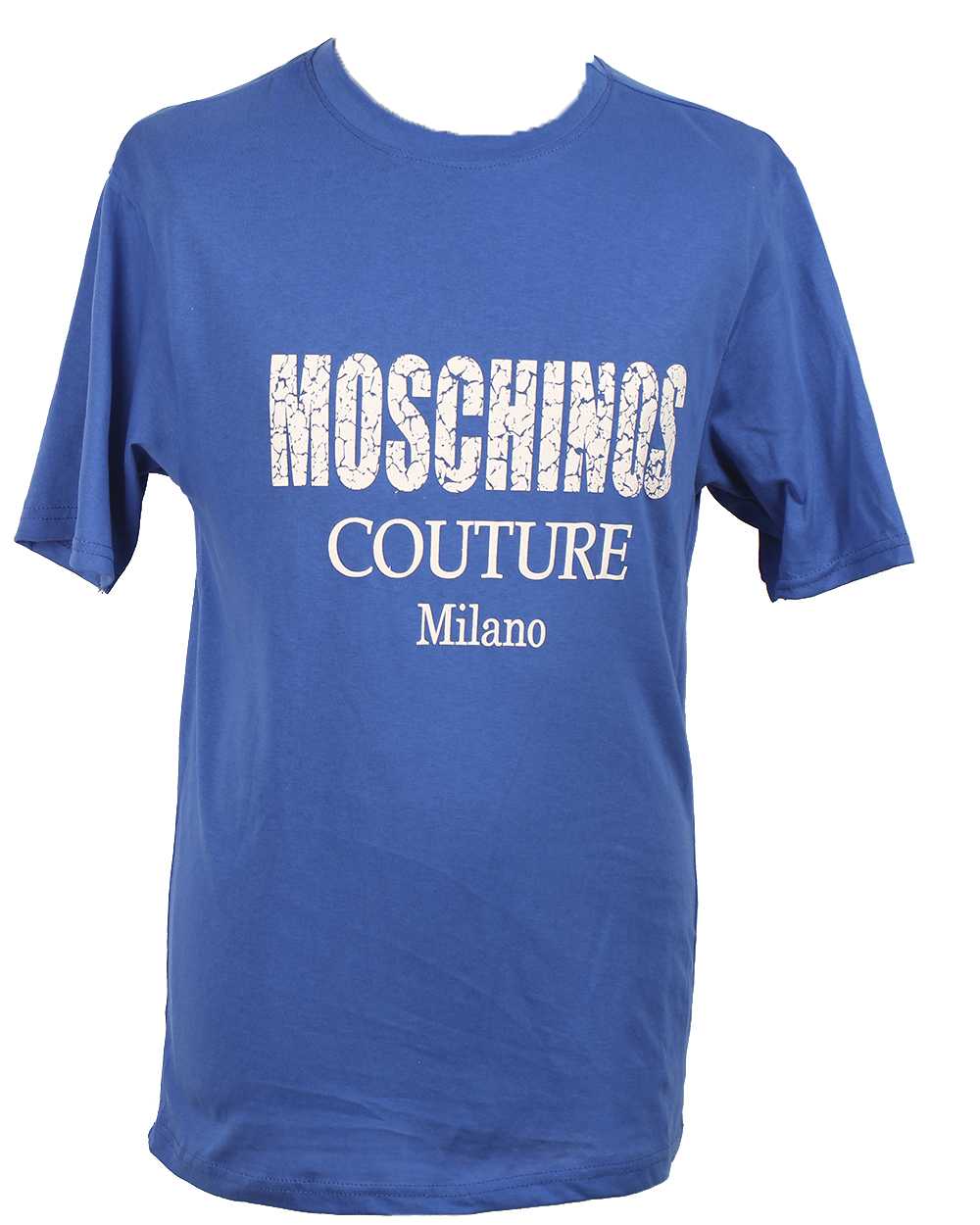 Мужская футболка светло-синего цвета с белой надписью на епередней части модели.