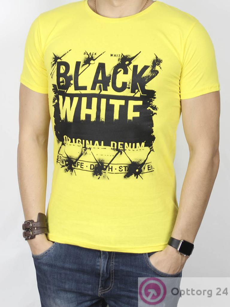 футболка мужская желтого цвеа с принтом в виде надписи черного цвета