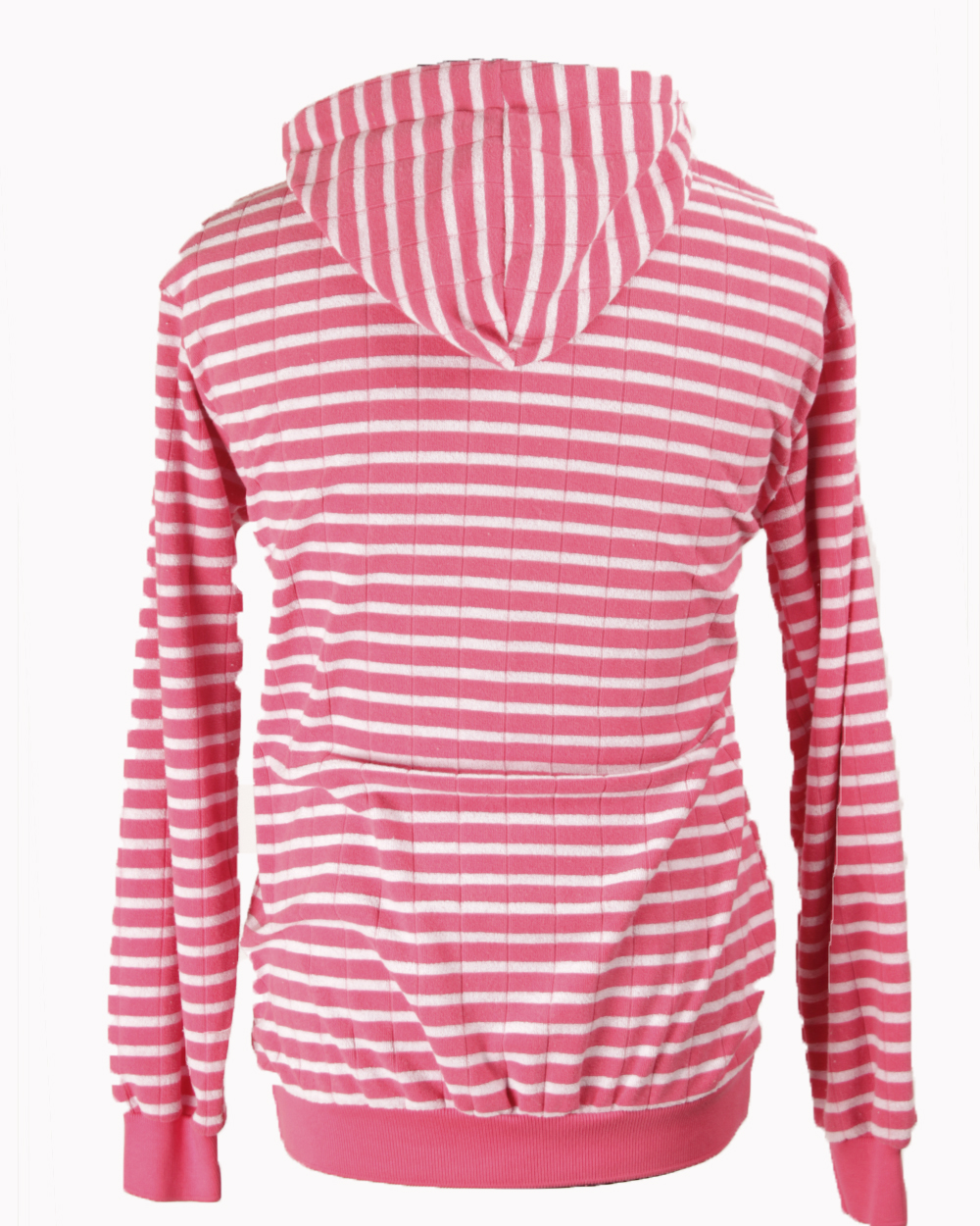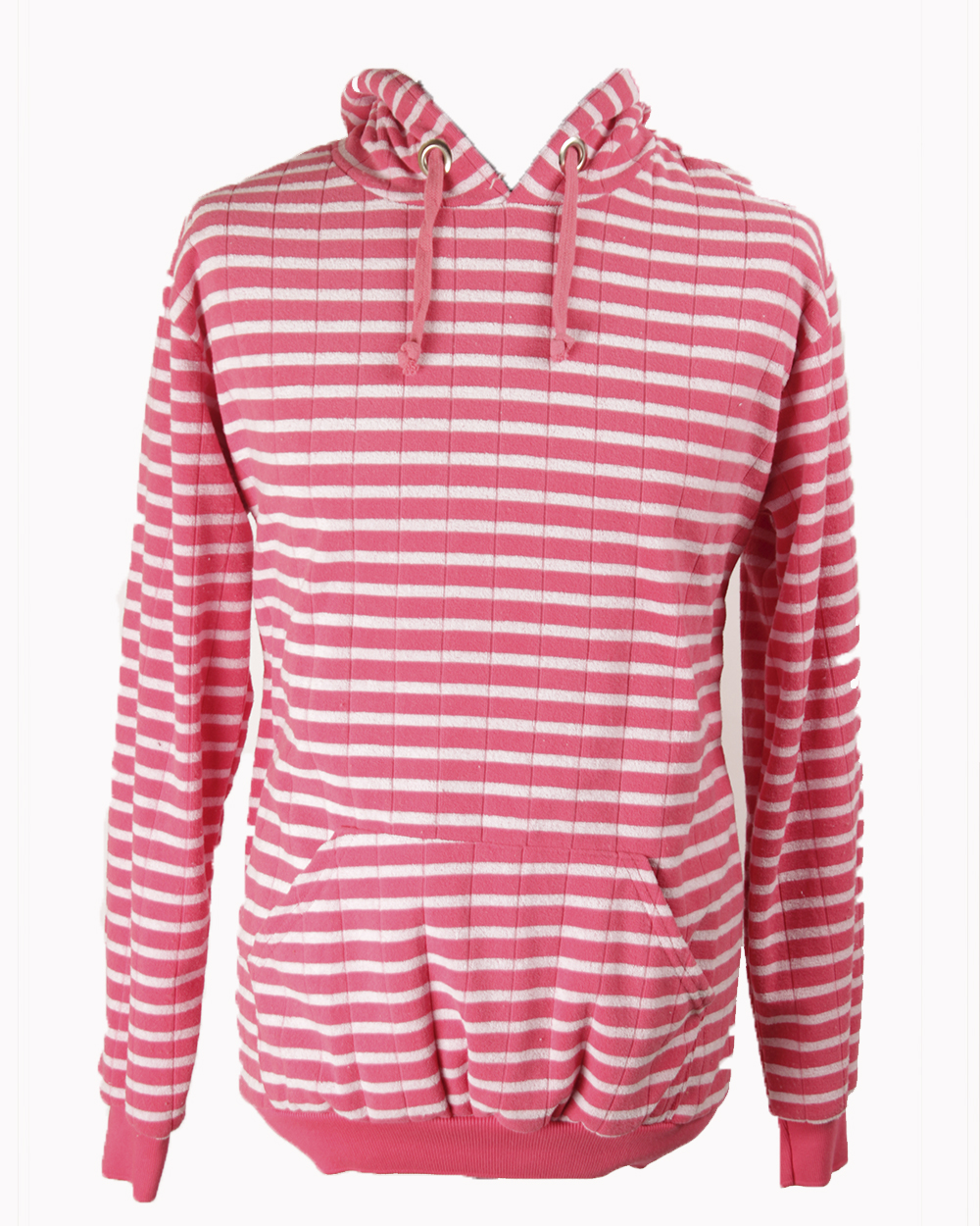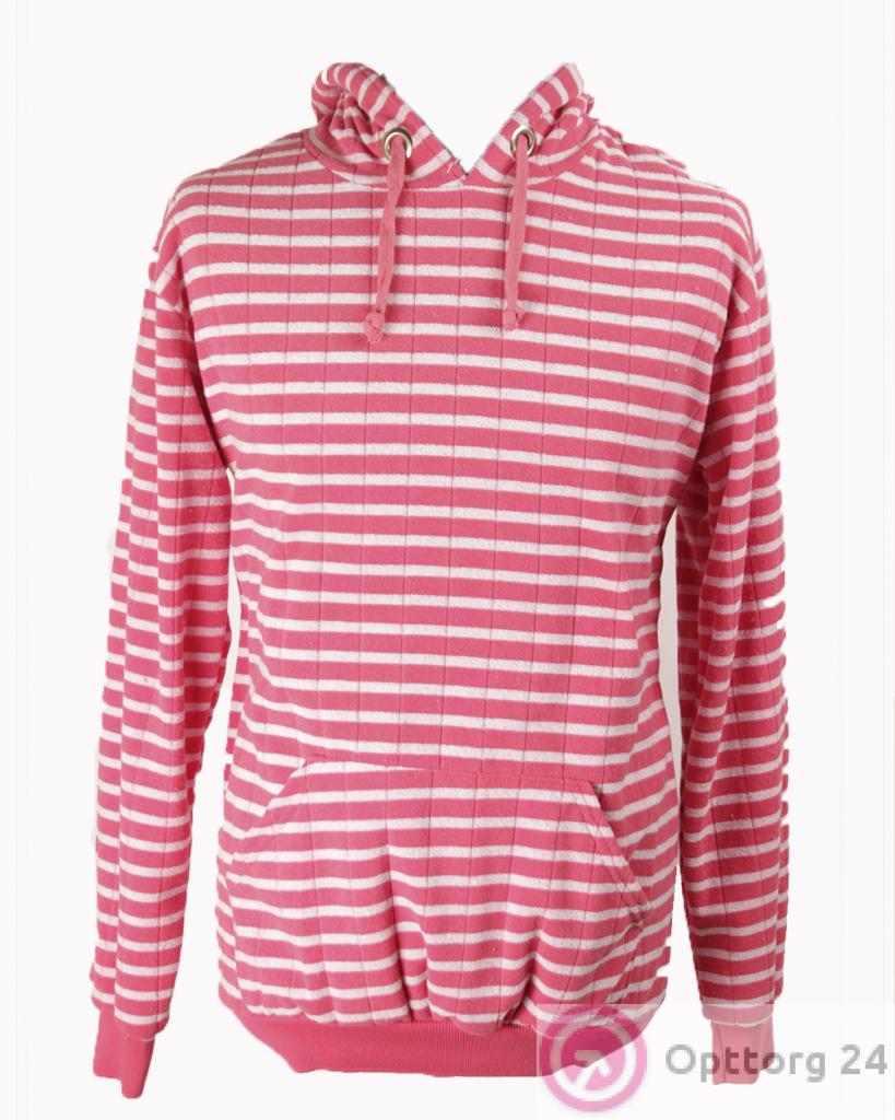 Мужская толстовка с капюшоном в бело-розовую горизонтальную полоску.