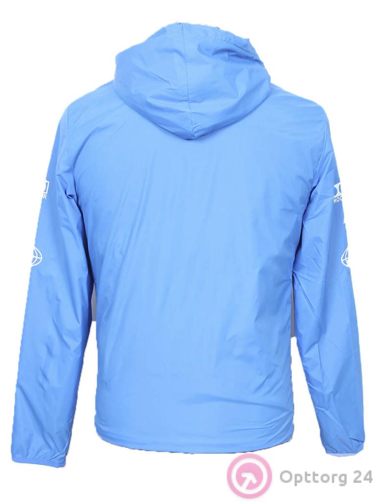 Мужская ветровка голубого цвета с принтом в виде надписи.