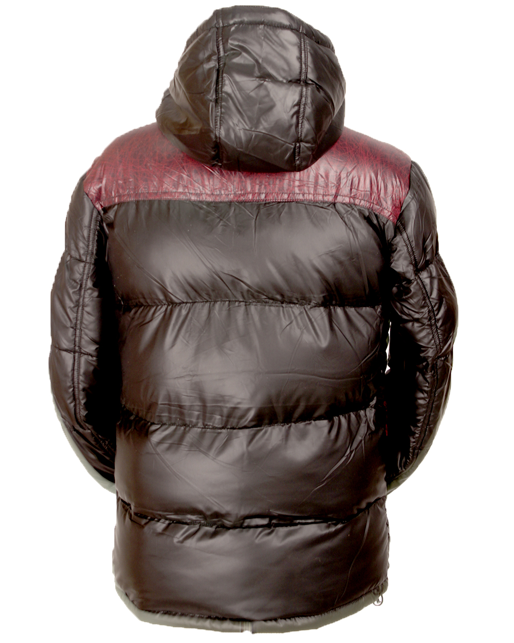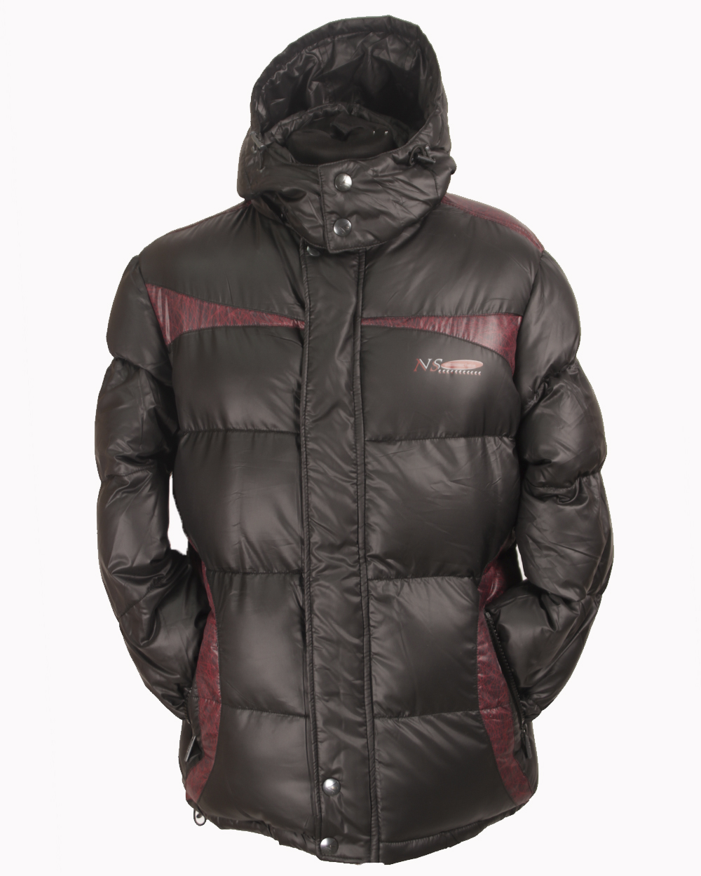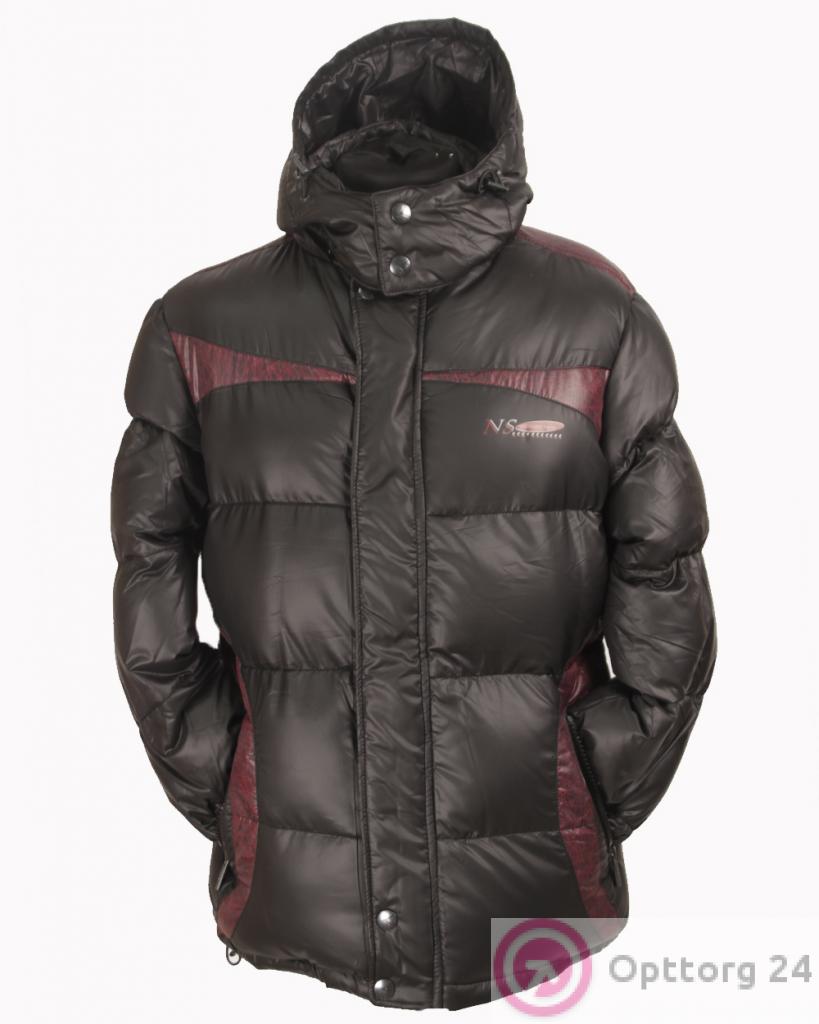 Мужской пуховик на двойном синтепоне черного цвета. Модель имеет тёмно-красные вставки на груди и плечах.
