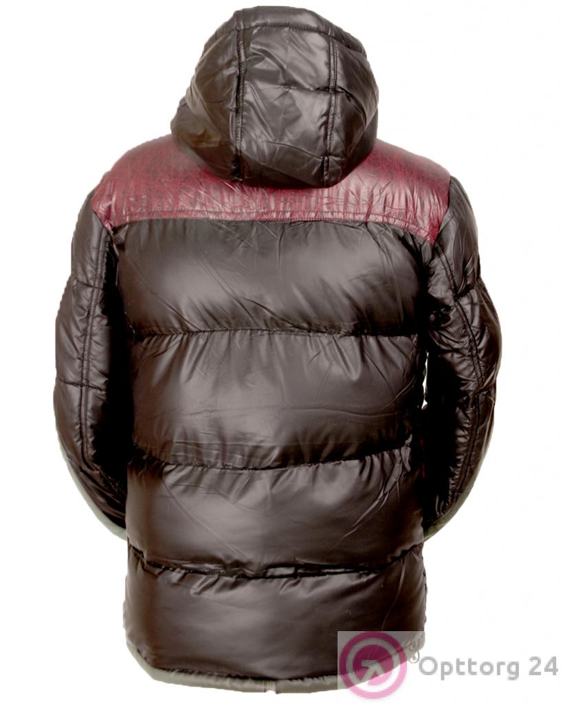 Мужской пуховик черного цвета с тёмно-красными вставками с узором оптом