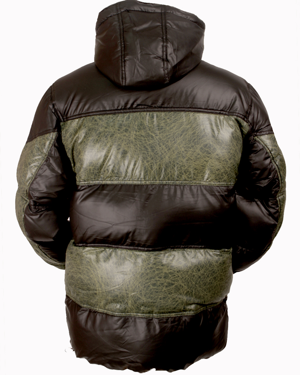 Пуховик мужской на двойном синтепоне черного цвета, с вставками тёмно-зеленого цвета с узором.