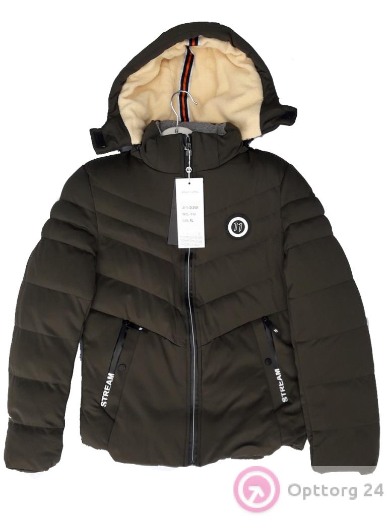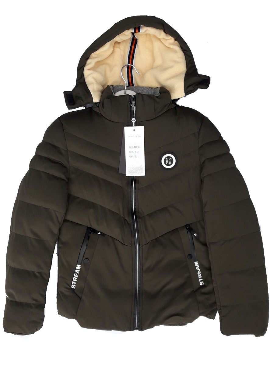 Коричневый пуховик для мужчин с капюшоном и карманами. По середине - молния.