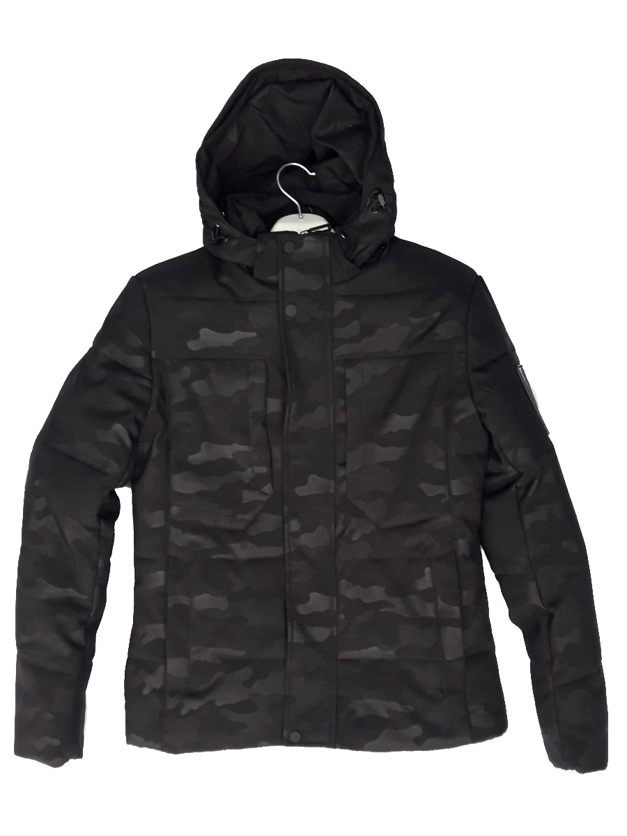Пуховик на зиму для мужчин серого защитного цвета с капюшоном и карманами. По середине - молния. Удобный и практичный.