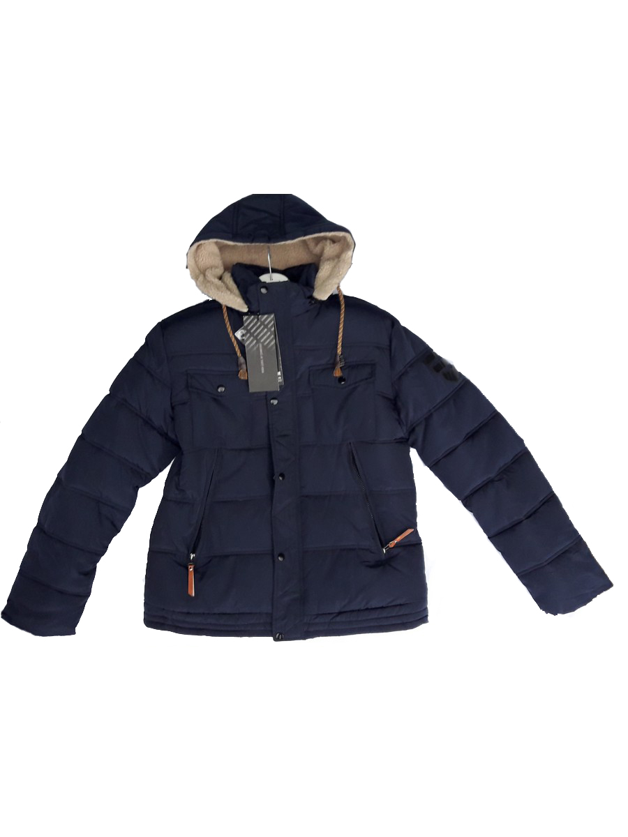 Синий зимний пуховик для мужчин с карманами и капюшоном. Теплый и удобный.