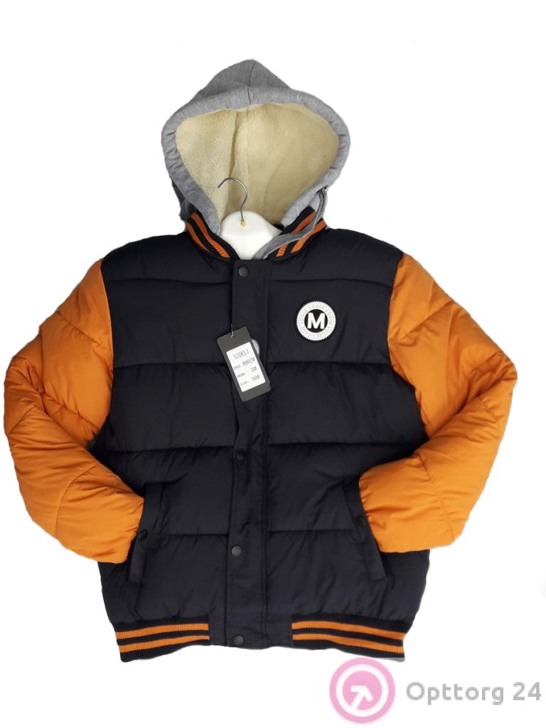 Зимний пуховик для мужчины на холлофайбере темно-синего цвета с серым капюшоном и оранжевыми рукавами. По бокам карманы. Снизу на резинке. Стильный и теплый.