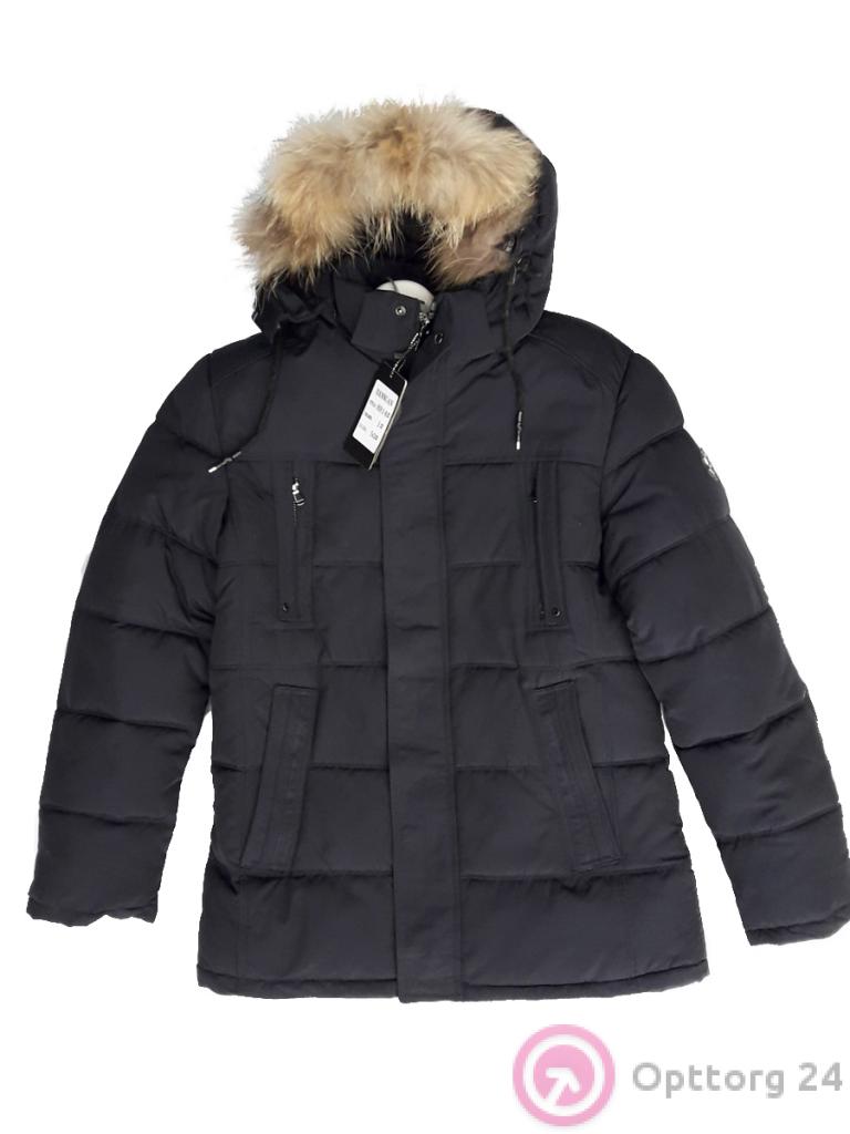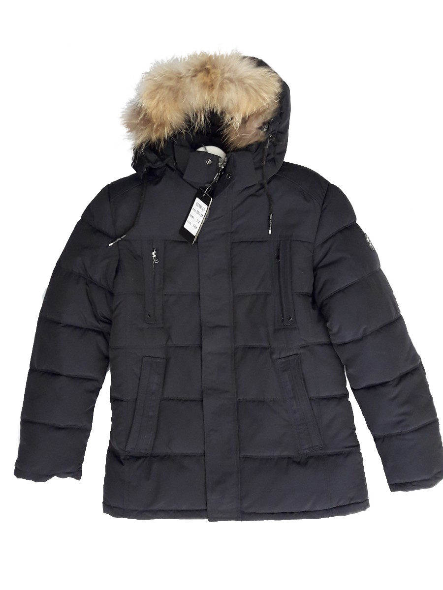 Пуховик мужской черного цвета с карманами и капюшоном с натуральным мехом. Теплый и удобный.