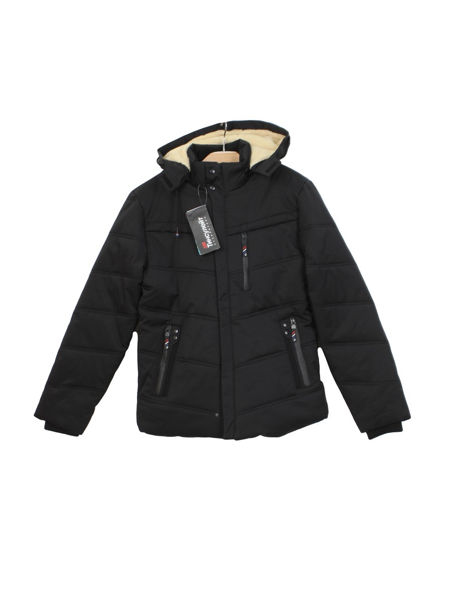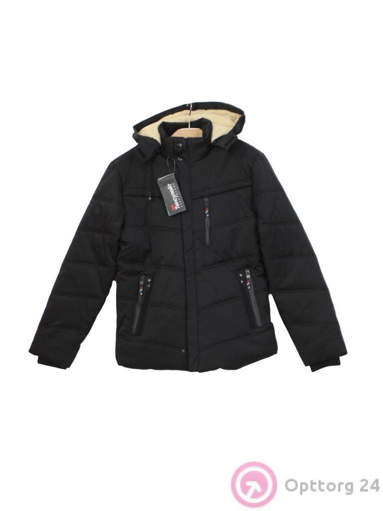 Зимний пуховик для мужчин с карманами и капюшоном. Капюшон и половина спинки оторочены мехом овчины.