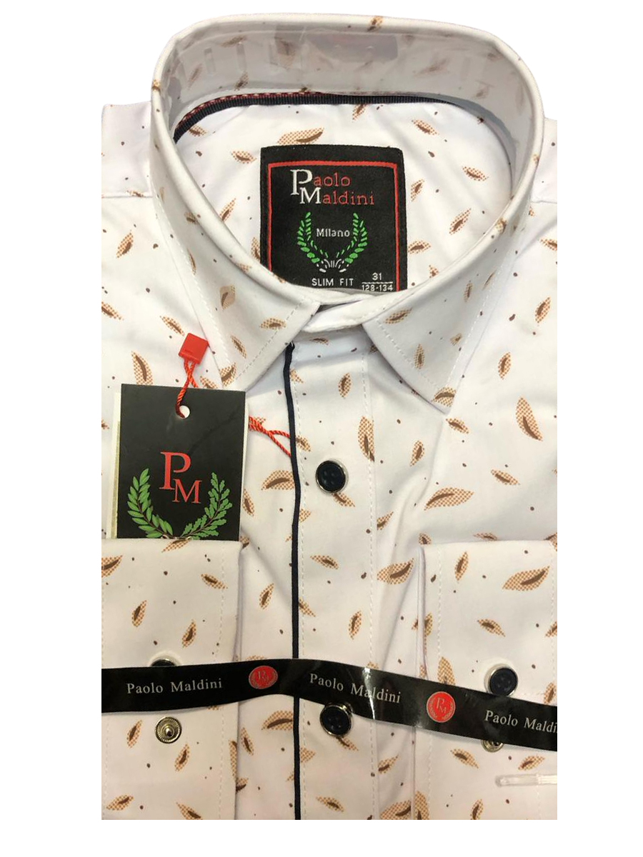 Описание: Рубашка мужская классическая приталенная Paolo Maldini с длинным рукавом, с приятным рисунком растительность, основной цвет белый, два кармана, застежка стильные кнопки имитирующие пуговицы.
