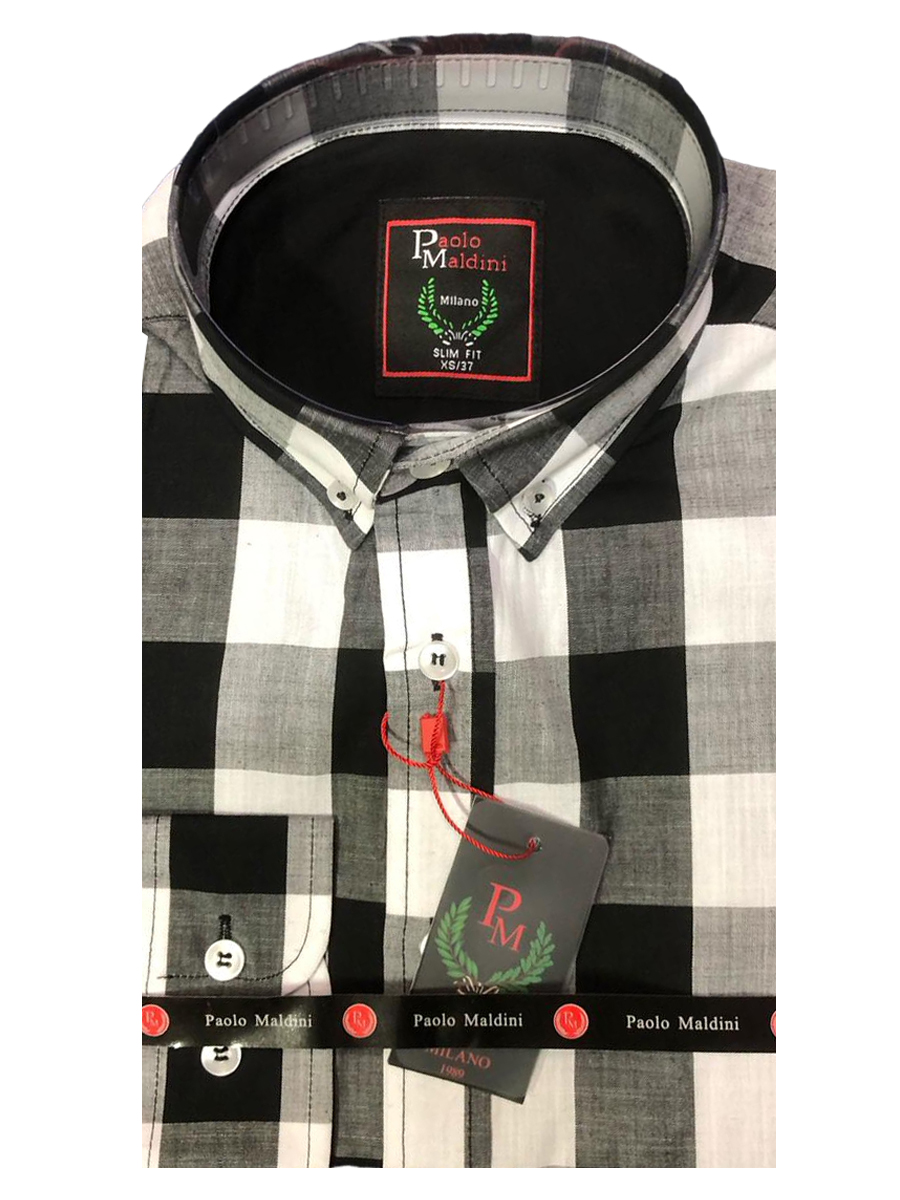 Описание: Рубашка мужская классическая приталенная Paolo Maldini с длинным рукавом, крупная черно-белая клетка, воротничок отложной, с карманом, на пуговицах.