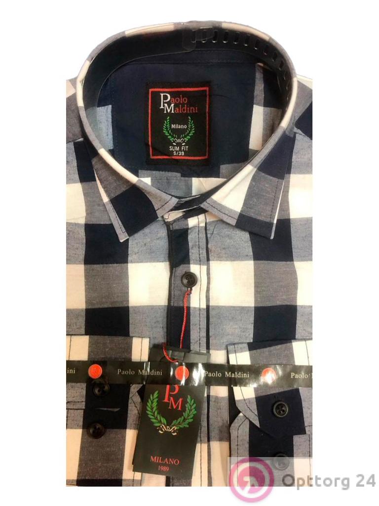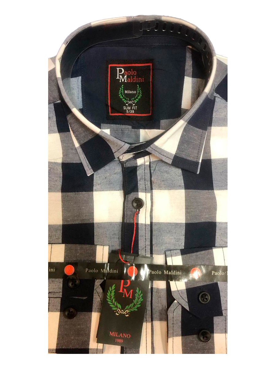 Описание: Рубашка мужская Paolo Maldini, с длинным рукавом, из хлопка, на пуговицах, с нагрудным карманом, прямого кроя, бежевая в черно-серую клетку.