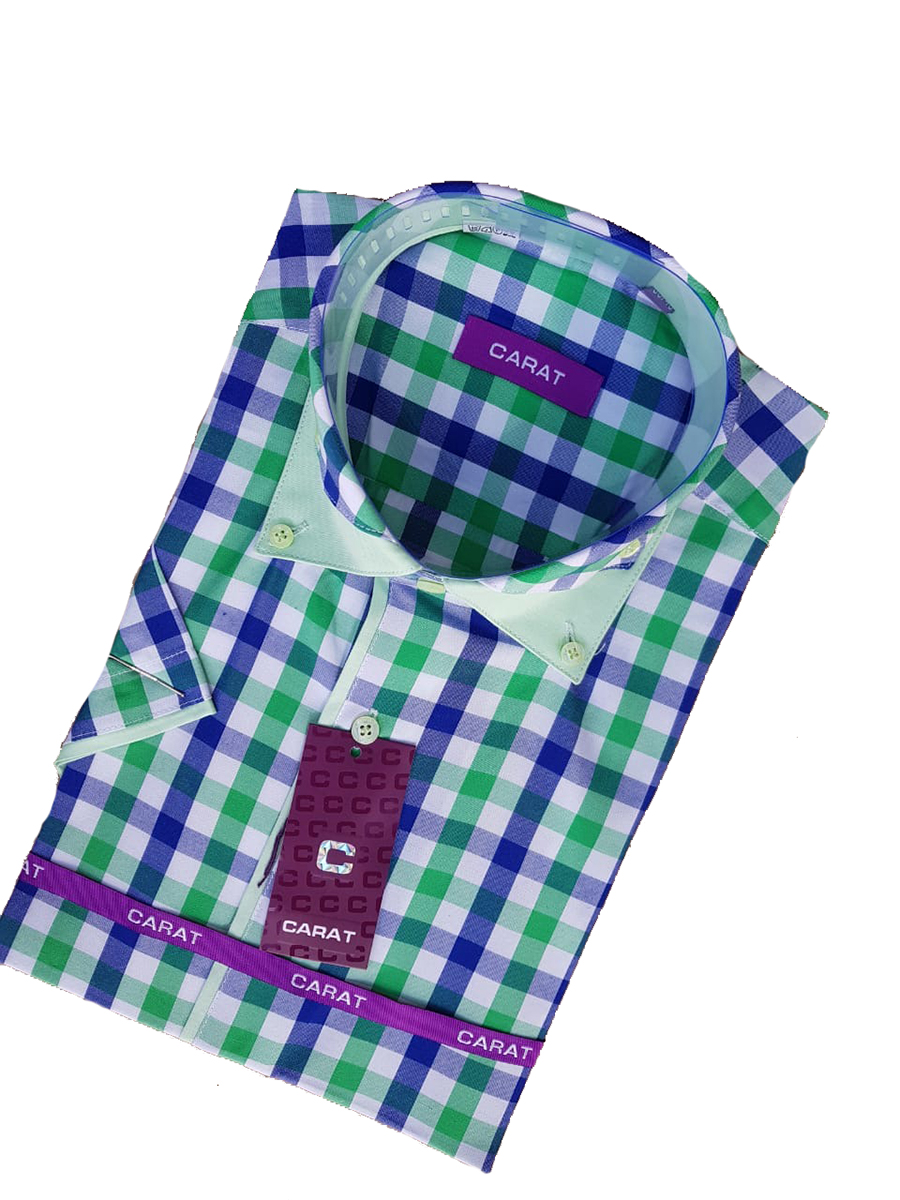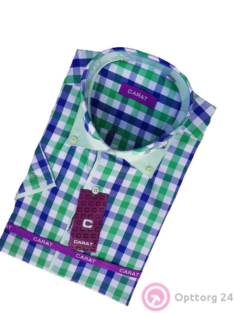 Описание: Рубашка мужская с коротким рукавом, в не большую клетку, в зелено-синих тонах. Застегивается на пуговицах. Воротничок со вставками и на пуговицах.