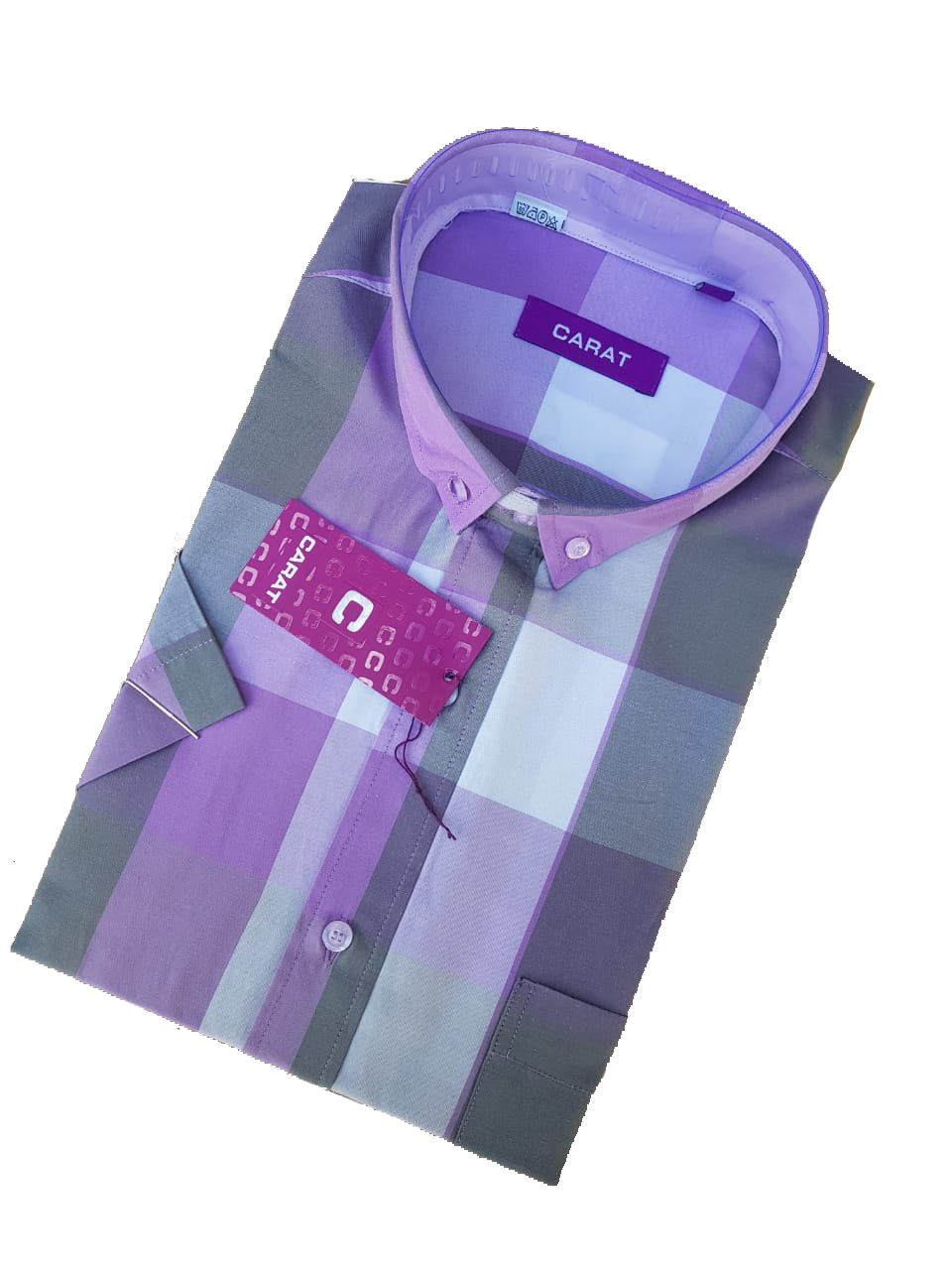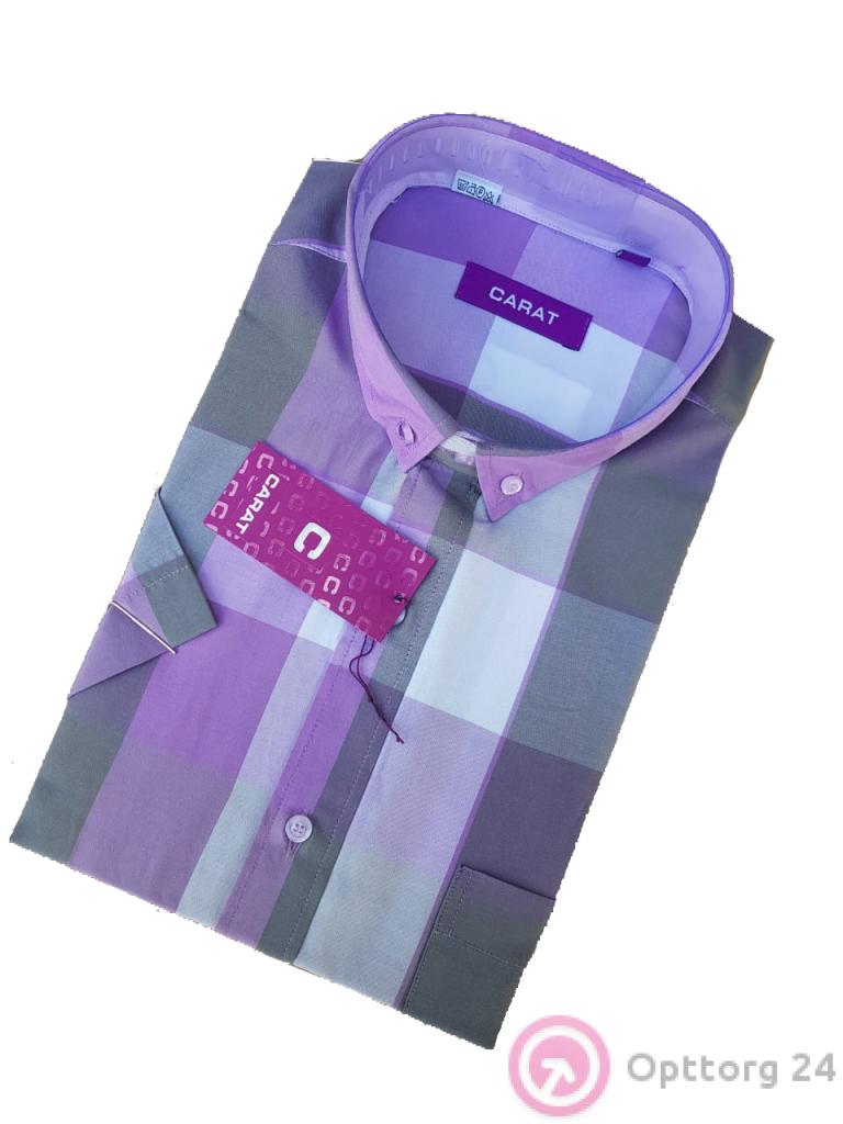 Описание: Рубашка мужская с коротким рукавом в крупную клетку с фиолетовыми тонами. Воротничок на пуговицах. Застегивается на пуговицах.