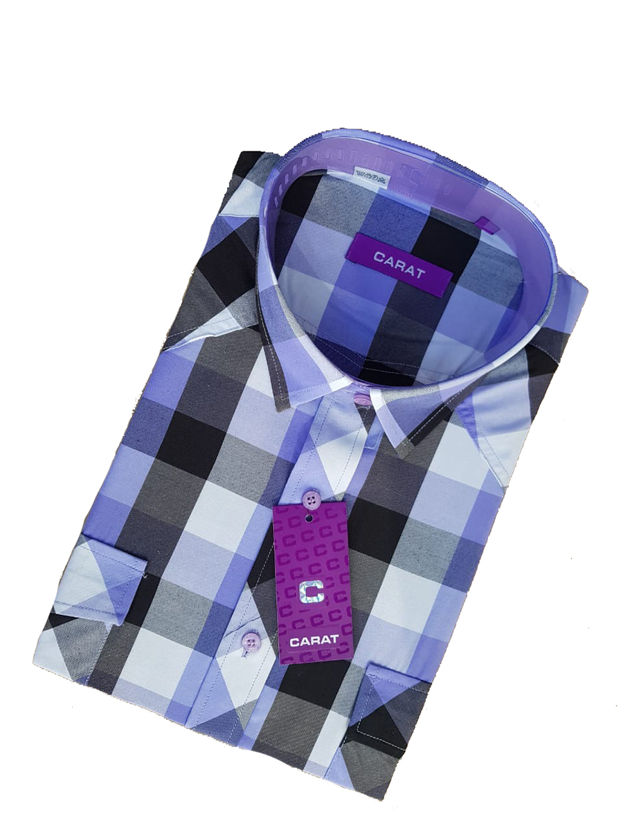 Описание: Рубашка мужская с коротким рукавом в крупную клетку с голубыми тонами. Застегивается на пуговицах.