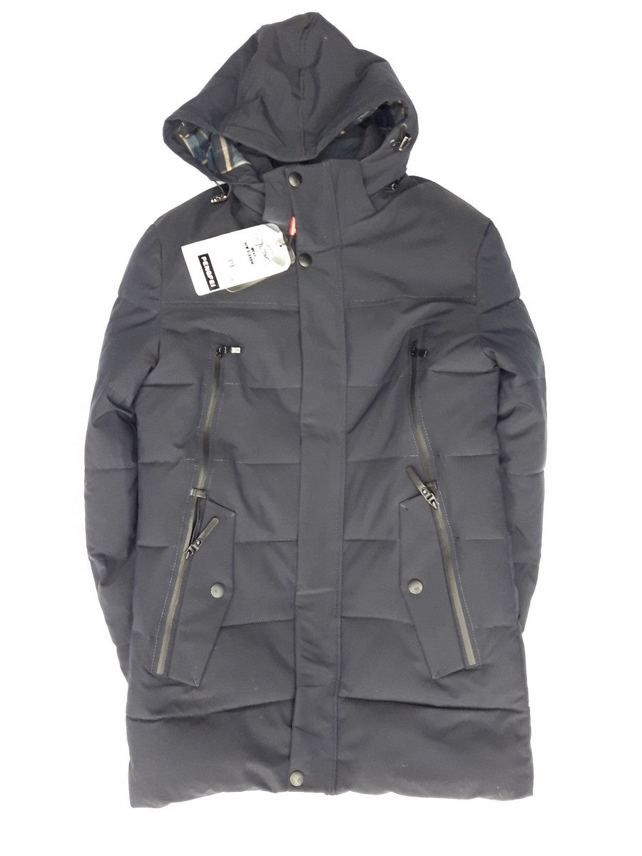Пуховик на зиму для мужчин серого цвета с капюшоном. По середине - молния. Молодежное и стильное изделие.