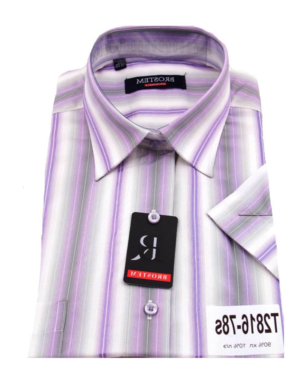 Рубашка белого цвета с фиолетовыми и серыми полосками станет отличным дополнением к гардеробу делового мужчины. Ее можно комбинировать как с джинсами, так и с брюками. Модель с короткими рукавами, оснащена удобным небольшим карманом на груди.